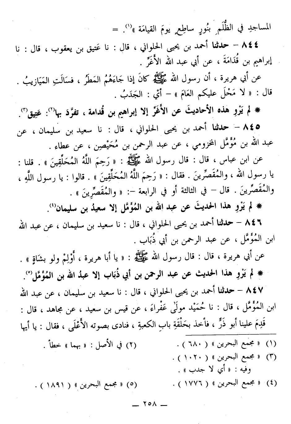 845 - حَدَّثَنَا أَحْمَدُ بْنُ يَحْيَى الْحُلْوَانِيُّ قَالَ: نا سَعِيدُ بْنُ سُلَيْمَانَ، عَنْ عَبْدِ اللَّهِ بْنِ مُؤَمَّلٍ الْمَخْزُومِيِّ، عَنْ عَبْدِ الرَّحْمَنِ بْنِ مُحَيْصِنٍ، عَنْ عَطَاءٍ، عَنِ ابْنِ عَبَّاسٍ قَالَ: قَالَ رَسُولُ اللَّهِ صَلَّى اللهُ عَلَيْهِ وَسَلَّمَ: «§رَحِمَ اللَّهُ الْمُحَلِّقِينَ» . قُلْنَا: يَا رَسُولَ اللَّهِ، وَالْمُقَصِّرِينَ. فَقَالَ: «رَحِمَ اللَّهُ الْمُحَلِّقِينَ» . قَالُوا: يَا رَسُولَ اللَّهِ، وَالْمُقَصِّرِينَ. قَالَ فِي الثَّالِثَةِ أَوْ فِي الرَّابِعَةِ: «وَالْمُقَصِّرِينَ»