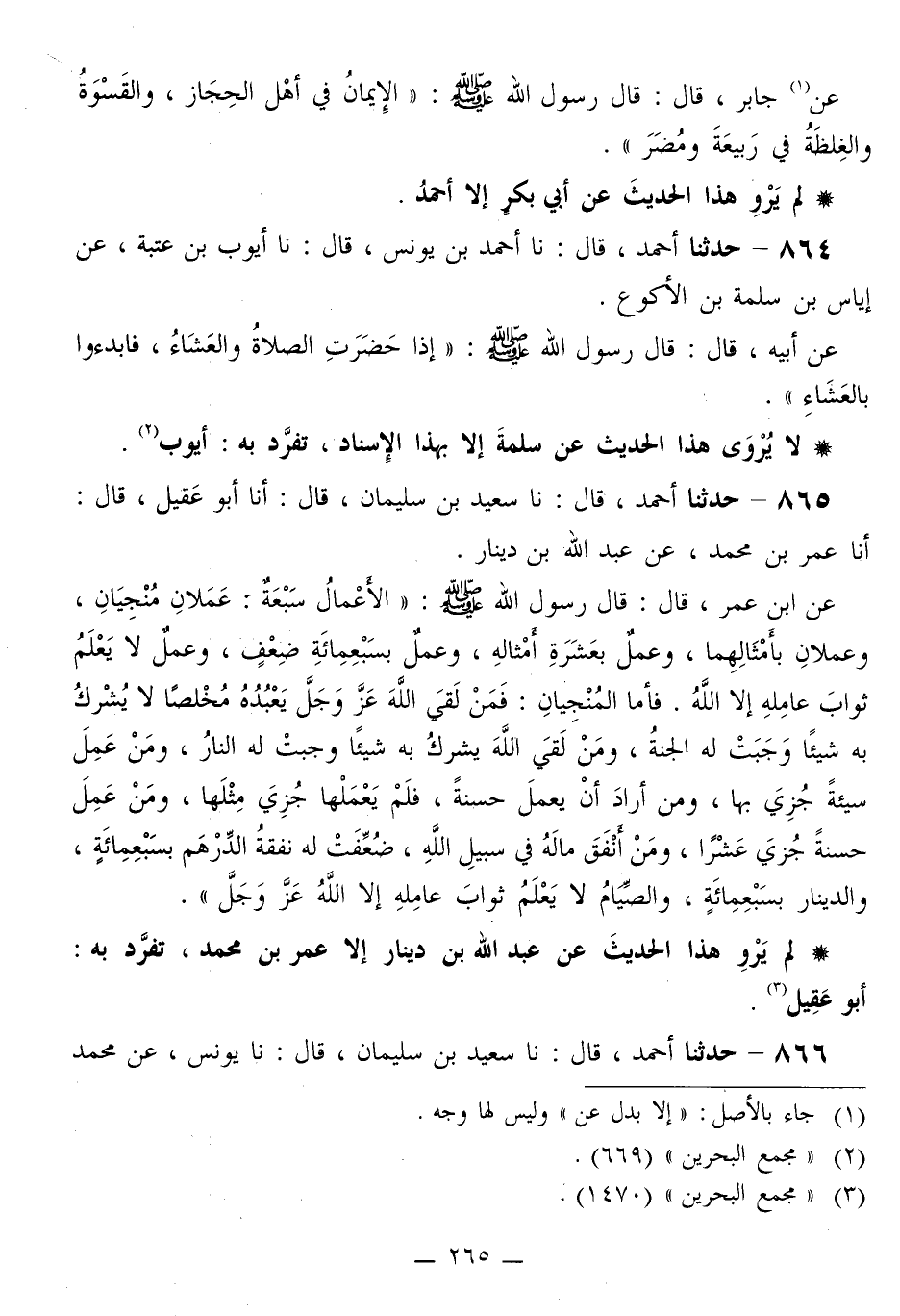 865 - حَدَّثَنَا أَحْمَدُ قَالَ: نا سَعِيدُ بْنُ سُلَيْمَانَ قَالَ: أنا أَبُو عَقِيلٍ قَالَ: أنا عُمَرُ بْنُ مُحَمَّدٍ، عَنْ عَبْدِ اللَّهِ بْنِ دِينَارٍ، عَنِ ابْنِ عُمَرَ قَالَ: قَالَ رَسُولُ اللَّهِ صَلَّى اللهُ عَلَيْهِ وَسَلَّمَ: «§الْأَعْمَالُ سَبْعَةٌ: عَمَلَانِ مُنْجِيَانِ، وعَمَلَانِ بأَمْثَالِهِمَا، وَعَمَلٌ بِعَشَرَةِ أَمْثَالِهِ، وَعَمَلٌ بسَبْعِمائَةِ ضِعْفٍ، وَعَمَلٌ لَا لَا يَعْلَمُ ثَوَابَ عَامِلِهِ إِلَّا اللَّهُ. فَأَمَّا الْمُنْجِيَانِ: فَمَنْ لَقِيَ اللَّهَ عَزَّ وَجَلَّ يَعْبُدُهُ مُخْلِصًا لَا يُشْرَكُ بِهِ شَيْئًا وَجَبَتْ لَهُ الْجَنَّةُ، وَمَنْ لَقِيَ اللَّهَ يُشْرَكُ بِهِ شَيْئًا وَجَبَتْ لَهُ النَّارُ، وَمَنْ عَمِلَ سَيِّئَةً جُزِيَ بِهَا، وَمَنْ أَرَادَ أَنْ يَعْمَلَ حَسَنَةً، فَلَمْ يَعْمَلْهَا جُزِيَ مِثْلَهَا، وَمَنْ عَمِلَ حَسَنَةً جُزِيَ عَشْرًا، وَمَنْ أَنْفَقَ مَالَهُ فِي سَبِيلِ اللَّهِ، ضُعِّفَتْ لَهُ نَفَقَةُ الدِّرْهَمِ بسَبْعِمائَةٍ، وَالدِّينَارُ بسَبْعِمائَةٍ، وَالصِّيَامُ لَا يَعْلَمُ ثَوَابَ عَامِلِهِ إِلَّا اللَّهُ عَزَّ وَجَلَّ»