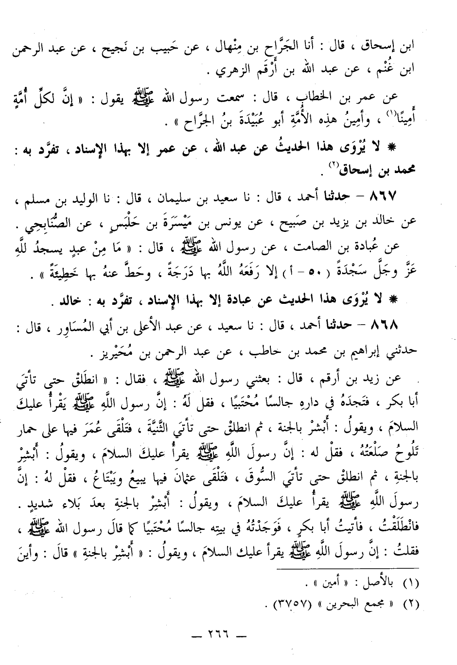 868 - حَدَّثَنَا أَحْمَدُ قَالَ: نا سَعِيدٌ، عَنْ عَبْدِ الْأَعْلَى بْنِ أَبِي الْمُسَاوِرِ قَالَ: حَدَّثَنِي إِبْرَاهِيمُ بْنُ مُحَمَّدِ بْنِ حَاطِبٍ، عَنْ عَبْدِ الرَّحْمَنِ بْنِ مُحَيْرِيزٍ، عَنْ زَيْدِ بْنِ أَرْقَمَ قَالَ: بَعَثَنِي رَسُولُ اللَّهِ صَلَّى اللهُ عَلَيْهِ وَسَلَّمَ، فَقَالَ: «§انْطَلِقْ حَتَّى تَأْتِيَ أَبَا بَكْرٍ، فَتَجِدَهُ فِي دَارِهِ جَالِسًا مُحْتَبِيًا، فَقُلْ لَهُ: إِنَّ رَسُولَ اللَّهِ صَلَّى اللهُ عَلَيْهِ وَسَلَّمَ يَقْرَأُ عَلَيْكَ السَّلَامَ، وَيَقُولُ: أَبْشِرْ بِالْجَنَّةِ، ثُمَّ انْطَلَقْ حَتَّى تَأْتِيَ الثَّنِيَّةَ، فَتَلْقَى عُمَرَ فِيهَا عَلَى حِمَارٍ تَلُوحُ صَلْعَتُهُ، فَقُلْ لَهُ: إِنَّ رَسُولَ اللَّهِ صَلَّى اللهُ عَلَيْهِ وَسَلَّمَ يَقْرَأُ عَلَيْكَ السَّلَامَ، وَيَقُولُ: أَبْشِرْ بِالْجَنَّةِ، ثُمَّ انْطَلِقْ حَتَّى تَأْتِيَ السُّوقَ، فَتَلْقَى عُثْمَانَ فِيهَا يَبِيعُ ويَبْتَاعُ، فَقُلْ لَهُ: إِنَّ رَسُولَ اللَّهِ صَلَّى اللهُ عَلَيْهِ وَسَلَّمَ يَقْرَأُ عَلَيْكَ السَّلَامَ، وَيَقُولُ: أَبْشِرْ بِالْجَنَّةِ بَعْدَ بَلَاءٍ شَدِيدٍ» فَانْطَلَقْتُ، فَأَتَيْتُ أَبَا بَكْرٍ، فَوَجَدْتُهُ فِي بَيْتِهِ جَالِسًا مُحْتَبِيًا كَمَا قَالَ رَسُولُ اللَّهِ صَلَّى اللهُ عَلَيْهِ وَسَلَّمَ، فَقُلْتُ: إِنَّ رَسُولَ اللَّهِ صَلَّى اللهُ عَلَيْهِ وَسَلَّمَ يَقْرَأُ عَلَيْكَ السَّلَامَ، وَيَقُولُ: «أَبْشِرْ بِالْجَنَّةِ» قَالَ: وَأَيْنَ -[267]- رَسُولُ اللَّهِ؟ قُلْتُ: فِي مَكَانِ كَذَا وَكَذَا، فَقَامَ إِلَيْهِ، ثُمَّ أَتَيْتُ الثَّنِيَّةَ، فَإِذَا فِيهَا عُمَرُ عَلَى حِمَارٍ تَلُوحُ صَلْعَتُهُ كَمَا قَالَ رَسُولُ اللَّهِ. فَقُلْتُ: إِنَّ رَسُولَ اللَّهِ صَلَّى اللهُ عَلَيْهِ وَسَلَّمَ يَقْرَأُ عَلَيْكَ السَّلَامَ، وَيَقُولُ: «أَبْشِرْ بِالْجَنَّةِ» قَالَ: وَأَيْنَ رَسُولُ اللَّهِ؟ فَقُلْتُ: فِي مَكَانِ كَذَا وَكَذَا، فَانْطَلَقَ إِلَيْهِ، ثُمَّ انْطَلَقْتُ حَتَّى أَتَيْتُ السُّوقَ، فَلَقِيتُ عُثْمَانَ فِيهَا يَبِيعُ ويَبْتَاعُ كَمَا قَالَ رَسُولُ اللَّهِ، فَقُلْتُ: إِنَّ رَسُولَ اللَّهِ صَلَّى اللهُ عَلَيْهِ وَسَلَّمَ يَقْرَأُ عَلَيْكَ السَّلَامَ، وَيَقُولُ: «أَبْشِرْ بِالْجَنَّةِ بَعْدَ بَلَاءٍ شَدِيدٍ» ، فَقَالَ: وَأَيْنَ رَسُولُ اللَّهِ؟ قُلْتُ: فِي مَكَانِ كَذَا وَكَذَا، فَأَخَذَ بِيَدِي فَجِئْنَا جَمِيعًا حَتَّى أَتَيْنَا رَسُولَ اللَّهِ صَلَّى اللهُ عَلَيْهِ وَسَلَّمَ، فَقَالَ لَهُ عُثْمَانُ: يَا رَسُولَ اللَّهِ، إِنَّ زَيْدًا أَتَانِي، فَقَالَ: إِنَّ رَسُولَ اللَّهِ صَلَّى اللهُ عَلَيْهِ وَسَلَّمَ يَقْرَأُ عَلَيْكَ السَّلَامَ، وَيَقُولُ: «أَبْشِرْ بِالْجَنَّةِ بَعْدَ بَلَاءٍ شَدِيدٍ» ، فَأَيُّ بَلَاءٍ يُصِيبُنِي يَا رَسُولَ اللَّهِ؟ وَالَّذِي بَعَثَكَ بِالْحَقِّ مَا تَعَنَّيْتُ وَلَا تَمَنَّيْتُ، وَلَا مَسِسْتُ ذَكَرِي بِيَمِينِي مُنْذُ بَايَعْتُكَ، فَقَالَ: «هُوَ ذَاكَ»