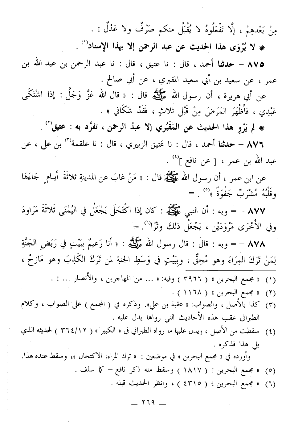 876 - حَدَّثَنَا أَحْمَدُ قَالَ: نا عَتِيقٌ الزُّبَيْرِيُّ قَالَ: نا عَلْقَمَةُ بْنُ عَلِيٍّ، عَنْ عَبْدِ اللَّهِ بْنِ عُمَرَ، عَنْ نَافِعٍ، عَنِ ابْنِ عُمَرَ، أَنَّ رَسُولَ اللَّهِ صَلَّى اللهُ عَلَيْهِ وَسَلَّمَ قَالَ: «§مَنْ غَابَ عَنِ الْمَدِينَةِ ثَلَاثَةَ أَيَّامٍ جَاءَهَا وَقَلْبُهُ مُشَرَّبٌ جَفْوَةً»