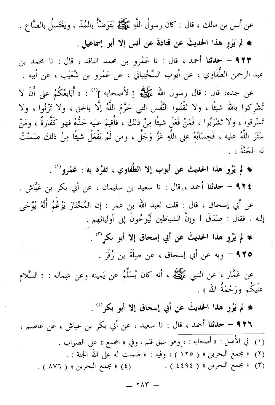 923 - حَدَّثَنَا أَحْمَدُ قَالَ: نا عَمْرُو بْنُ مُحَمَّدٍ النَّاقِدُ قَالَ: نا مُحَمَّدُ بْنُ عَبْدِ الرَّحْمَنِ الطُّفَاوِيُّ، عَنْ أَيُّوبَ السَّخْتِيَانِيِّ، عَنْ عَمْرِو بْنِ شُعَيْبٍ، عَنْ أَبِيهِ، عَنْ جَدِّهِ قَالَ: قَالَ رَسُولُ اللَّهِ صَلَّى اللهُ عَلَيْهِ وَسَلَّمَ لِأَصْحَابِهِ: «§أُبَايِعُكُمْ عَلَى أَنْ لَا تُشْرِكُوا بِاللَّهِ شَيْئًا، وَلَا تَقْتُلُوا النَّفْسَ الَّتِي حَرَّمَ اللَّهُ إِلَّا بِالْحَقِّ، وَلَا تَزْنُوا، وَلَا تَسْرِقُوا، وَلَا تَشْرَبُوا، فَمَنْ فَعَلَ شَيْئًا مِنْ ذَلِكَ، فَأُقِيمَ عَلَيْهِ حَدُّهُ فَهُوَ كَفَّارَةٌ، وَمَنْ سَتَرَ اللَّهُ عَلَيْهِ، فَحِسَابُهُ عَلَى اللَّهِ عَزَّ وَجَلَّ، وَمَنْ لَمْ يَفْعَلْ شَيْئًا مِنْ ذَلِكَ ضَمِنْتُ لَهُ الْجَنَّةَ»