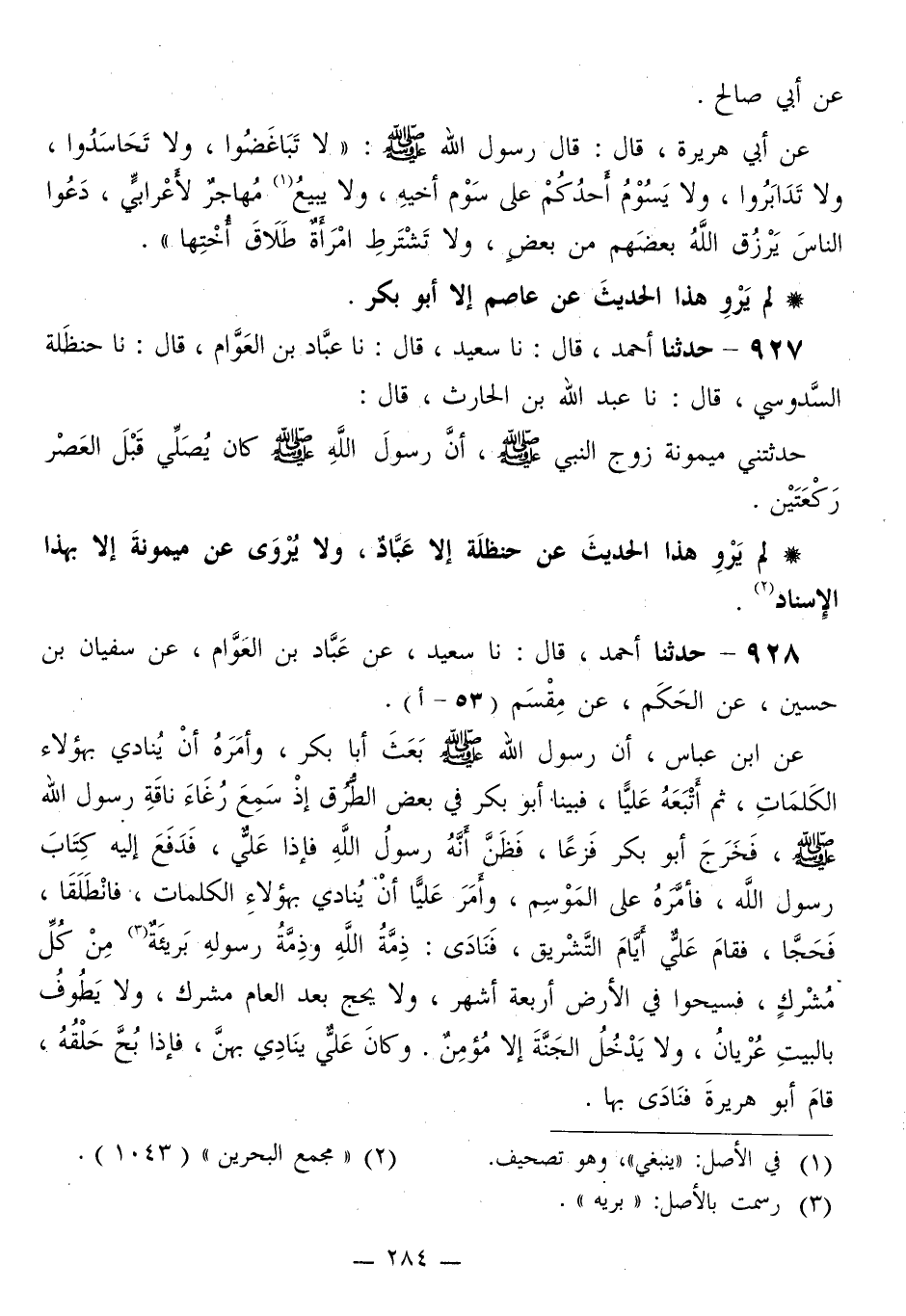928 - حَدَّثَنَا أَحْمَدُ قَالَ: نا سَعِيدٌ، عَنْ عَبَّادِ بْنِ الْعَوَّامِ، عَنْ سُفْيَانَ بْنِ حُسَيْنٍ، عَنِ الْحَكَمِ، عَنْ مِقْسَمٍ، عَنِ ابْنِ عَبَّاسٍ، أَنَّ رَسُولَ اللَّهِ صَلَّى اللهُ عَلَيْهِ وَسَلَّمَ بَعَثَ أَبَا بَكْرٍ، وَأَمَرَهُ أَنْ يُنَادِيَ بِهَؤُلَاءِ الْكَلِمَاتِ، ثُمَّ أَتْبَعَهُ عَلِيًّا، فَبَيْنَا أَبُو بَكْرٍ فِي بَعْضِ الطُّرُقِ إِذْ سَمِعَ رُغَاءَ نَاقَةِ رَسُولِ اللَّهِ صَلَّى اللهُ عَلَيْهِ وَسَلَّمَ، فَخَرَجَ أَبُو بَكْرٍ فَزِعًا، فَظَنَّ أَنَّهُ رَسُولُ اللَّهِ فَإِذَا عَلِيٌّ، فَدَفَعَ إِلَيْهِ كِتَابَ رَسُولِ اللَّهِ، فَأَمَّرَهُ عَلَى الْمَوْسِمِ، وَأَمَرَ عَلِيًّا أَنْ يُنَادِيَ بِهَؤُلَاءِ الْكَلِمَاتِ، فَانْطَلَقَا، فَحَجَّا، فَقَامَ عَلِيٌّ أَيَّامَ التَّشْرِيقِ، فَنَادَى: «§ذِمَّةُ اللَّهِ وَذِمَّةُ رَسُولِهِ بَرِيئَةٌ مِنْ كُلِّ مُشْرِكٍ، فَسِيحُوا فِي الْأَرْضِ أَرْبَعَةَ أَشْهُرٍ، وَلَا يَحُجُّ بَعْدَ الْعَامِ مُشْرِكٌ، وَلَا يَطُوفُ بِالْبَيْتِ عُرْيَانٌ، وَلَا يَدْخُلُ الْجَنَّةَ إِلَّا مُؤْمِنٌ» وَكَانَ عَلِيٌّ يُنَادِي بِهِنَّ، فَإِذَا بُحَّ حَلْقُهُ، قَامَ أَبُو هُرَيْرَةَ فَنَادَى بِهَا