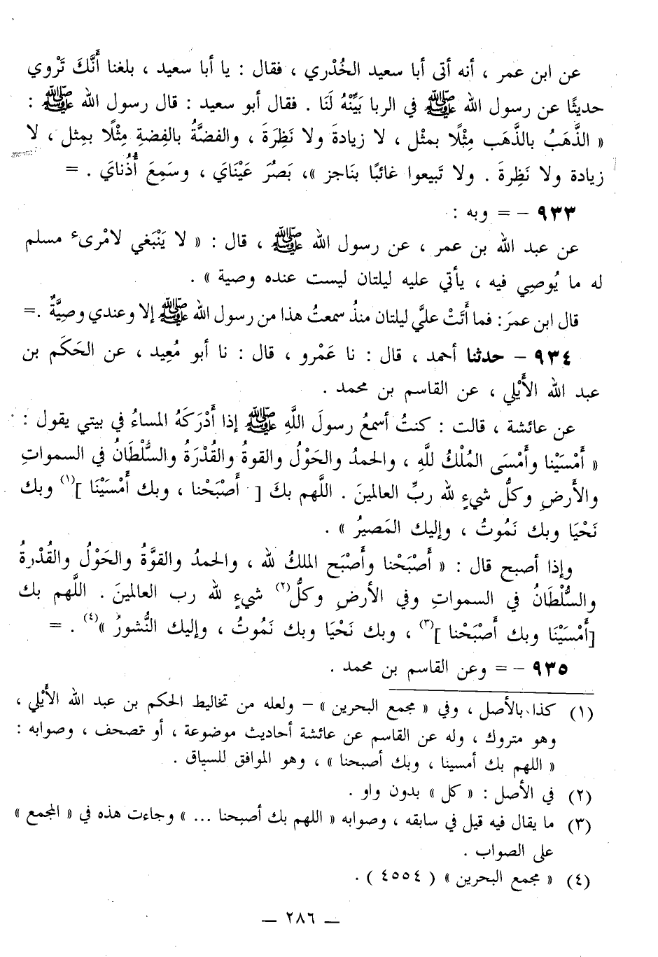 934 - حَدَّثَنَا أَحْمَدُ قَالَ: نا عَمْرٌو قَالَ: نا أَبُو مُعَيْدٍ، عَنِ الْحَكَمِ بْنِ عَبْدِ اللَّهِ الْأَيْلِيِّ، عَنِ الْقَاسِمِ بْنِ مُحَمَّدٍ، عَنْ عَائِشَةَ، قَالَتْ: كُنْتُ أَسْمَعُ رَسُولَ اللَّهِ صَلَّى اللهُ عَلَيْهِ وَسَلَّمَ إِذَا أَدْرَكَهُ الْمَسَاءُ فِي بَيْتِي يَقُولُ: «§أَمْسَيْنَا وَأَمْسَى الْمُلْكُ لِلَّهِ، وَالْحَمْدُ وَالْحِوَلُ وَالْقُوَّةُ وَالْقُدْرَةُ وَالسُّلْطَانُ فِي السَّمَوَاتِ وَالْأَرْضِ وَكُلُّ شَيْءِ لِلَّهِ رَبِّ الْعَالَمِينَ. اللَّهُمَّ بِكَ أَصْبَحْنَا، وَبِكَ أَمْسَيْنَا وَبِكَ نَحْيَا وَبِكَ نَمُوتُ، وَإِلَيْكَ الْمَصِيرُ» . وَإِذَا أَصْبَحَ قَالَ: «أَصْبَحْنَا وَأَصْبَحَ الْمُلْكُ لِلَّهِ، وَالْحَمْدُ وَالْقُوَّةُ وَالْحِوَلُ وَالْقُدْرَةُ وَالسُّلْطَانُ فِي السَّمَوَاتِ وَفِي الْأَرْضِ وَكُلُّ شَيْءٍ لِلَّهِ رَبِّ الْعَالَمِينَ. اللَّهُمَّ بِكَ أَمْسَيْنَا وَبِكَ أَصْبَحْنَا، وَبِكَ نَحْيَا وَبِكَ نَمُوتُ، وَإِلَيْكَ النُّشُورُ»