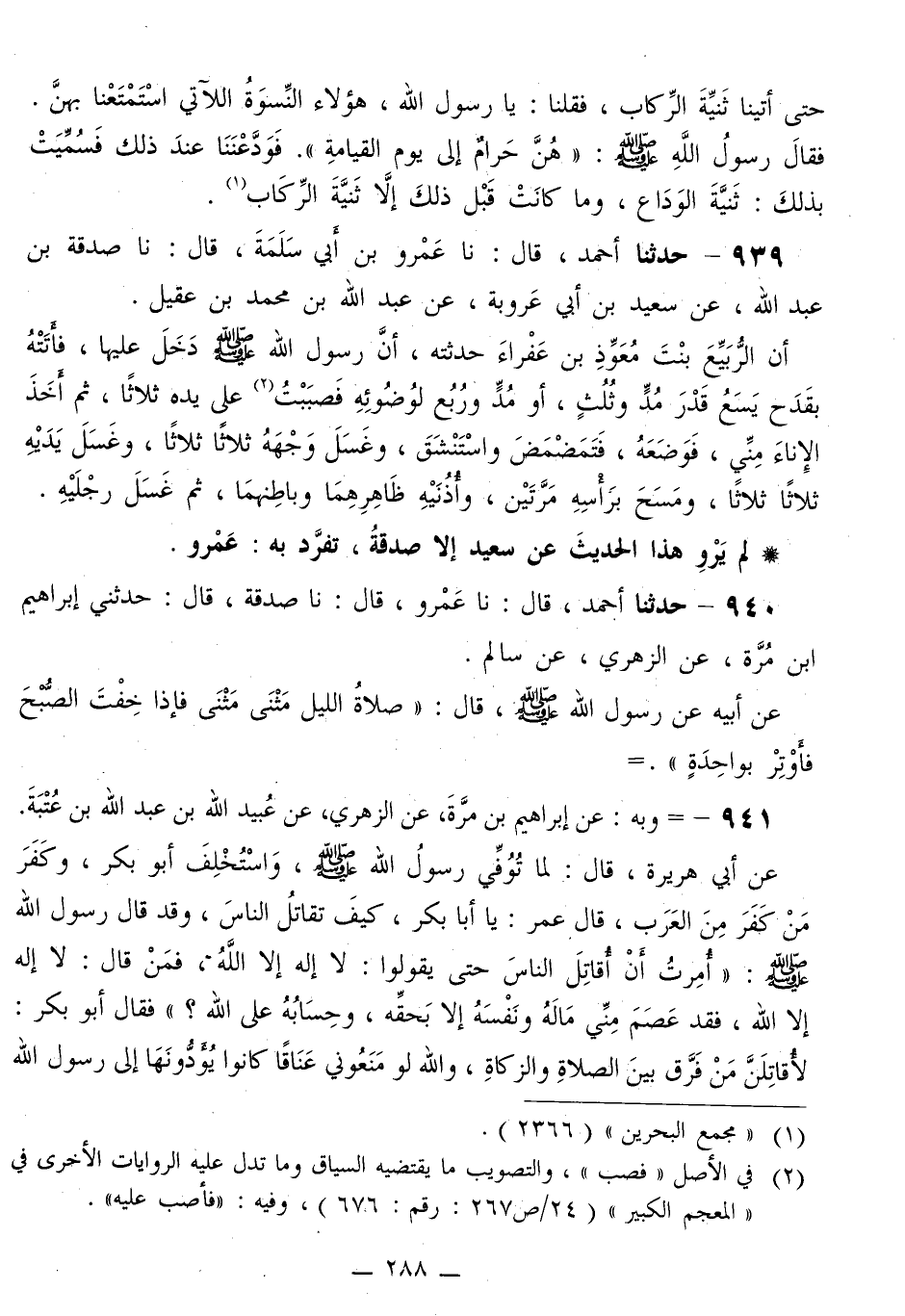 940 - حَدَّثَنَا أَحْمَدُ قَالَ: نا عَمْرُو قَالَ: نا صَدَقَةُ قَالَ: حَدَّثَنِي إِبْرَاهِيمُ بْنُ مُرَّةَ، عَنِ الزُّهْرِيِّ، عَنْ سَالِمٍ، عَنْ أَبِيهِ، عَنْ رَسُولِ اللَّهِ صَلَّى اللهُ عَلَيْهِ وَسَلَّمَ قَالَ: «§صَلَاةُ اللَّيْلِ مَثْنَى مَثْنَى، فَإِذَا خِفْتَ الصُّبْحَ فَأَوْتِرْ بِوَاحِدَةٍ»