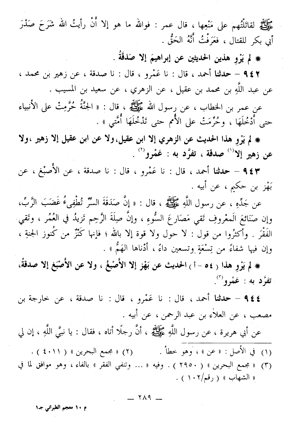 942 - حَدَّثَنَا أَحْمَدُ قَالَ: نا عَمْرٌو قَالَ: نا صَدَقَةُ، عَنْ زُهَيْرِ بْنِ مُحَمَّدٍ، عَنْ عَبْدِ اللَّهِ بْنِ مُحَمَّدِ بْنِ عَقِيلٍ، عَنِ الزُّهْرِيِّ، عَنْ سَعِيدِ بْنِ الْمُسَيِّبِ، عَنْ عُمَرَ بْنِ الْخَطَّابِ، عَنْ رَسُولِ اللَّهِ صَلَّى اللهُ عَلَيْهِ وَسَلَّمَ قَالَ: «§الْجَنَّةُ حُرِّمَتْ عَلَى الْأَنْبِيَاءِ حَتَّى أَدْخُلَهَا، وَحُرِّمَتْ عَلَى الْأُمَمِ حَتَّى تَدْخُلَهَا أُمَّتِي»