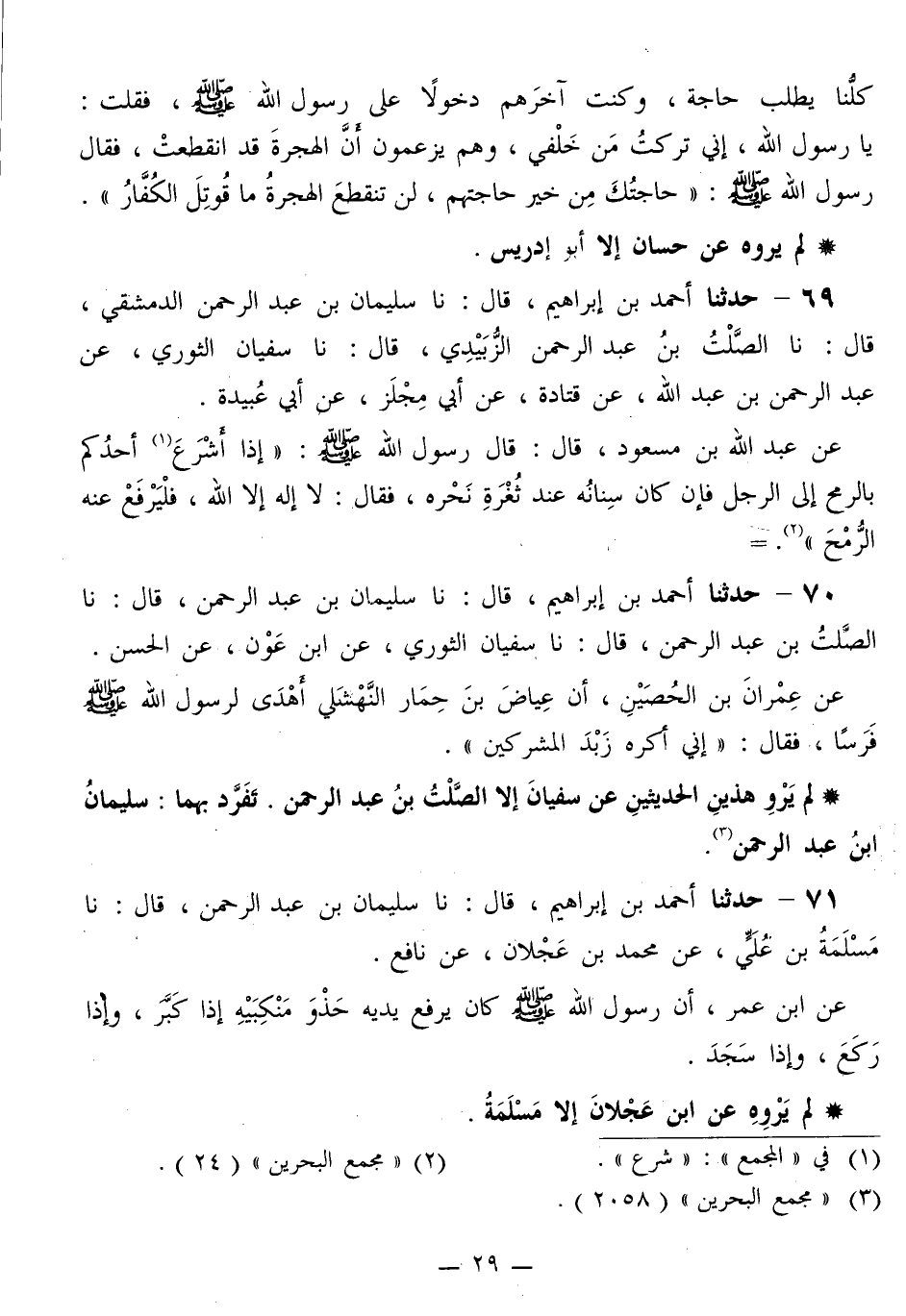 70 - حَدَّثَنَا أَحْمَدُ بْنُ إِبْرَاهِيمَ قَالَ: نا سُلَيْمَانُ بْنُ عَبْدِ الرَّحْمَنِ قَالَ: نا الصَّلْتُ بْنُ عَبْدِ الرَّحْمَنِ قَالَ: نا سُفْيَانُ الثَّوْرِيُّ، عَنِ ابْنِ عَوْنٍ، عَنِ الْحَسَنِ، عَنْ عِمْرَانَ بْنِ الْحُصَيْنِ، أَنَّ عِيَاضَ بْنَ حِمَارٍ النَّهْشَلِيَّ، أَهْدَى لِرَسُولِ اللَّهِ صَلَّى اللهُ عَلَيْهِ وَسَلَّمَ فَرَسًا، فَقَالَ: «§إِنِّي أَكْرَهُ زَبَدَ الْمُشْرِكِينَ»