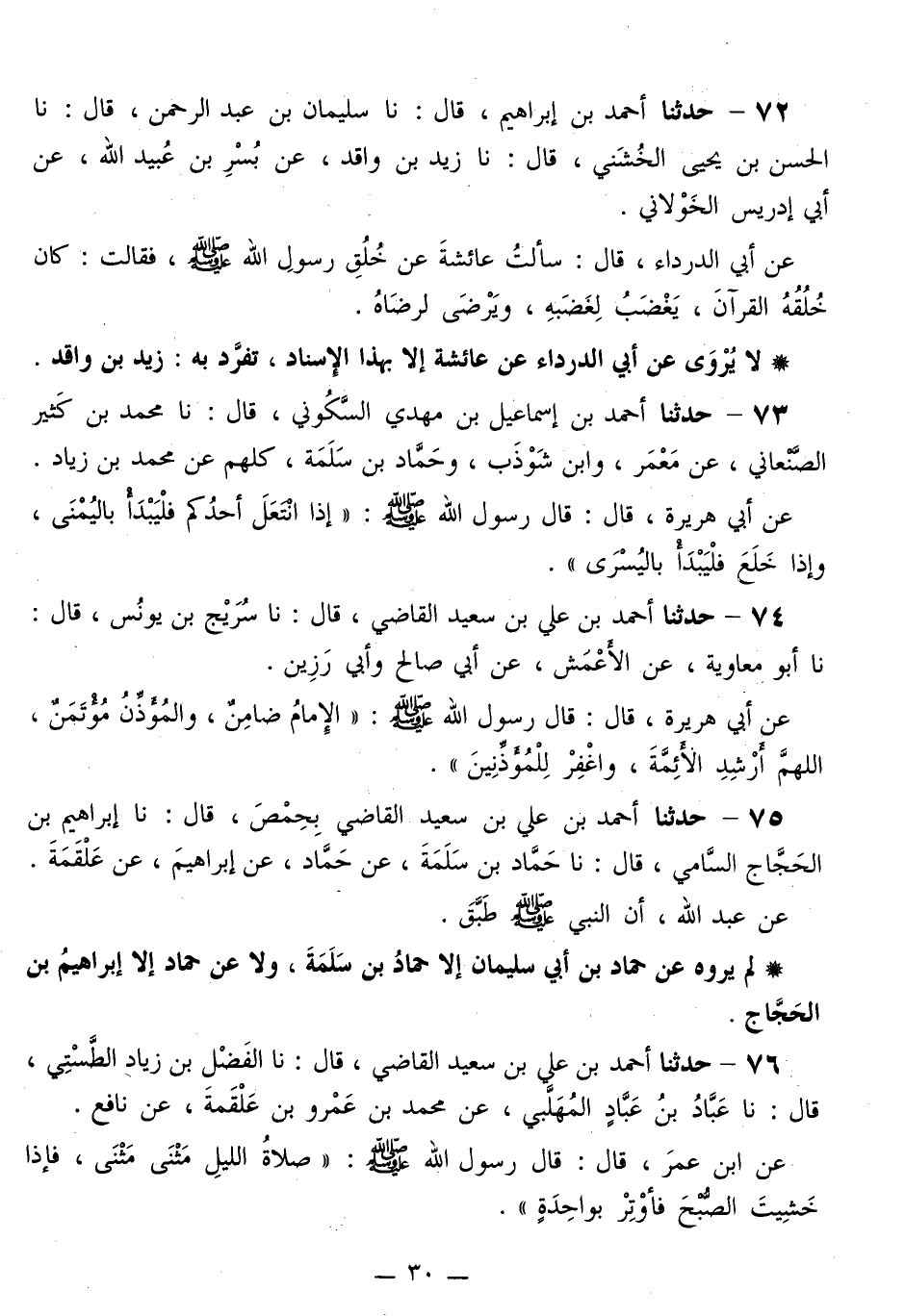 75 - حَدَّثَنَا أَحْمَدُ بْنُ عَلِيِّ بْنِ سَعِيدٍ الْقَاضِي، بِحِمْصَ قَالَ: نا إِبْرَاهِيمُ بْنُ الْحَجَّاجِ السَّامِي قَالَ: نا حَمَّادُ بْنُ سَلَمَةَ، عَنْ حَمَّادٍ، عَنْ إِبْرَاهِيمَ، عَنْ عَلْقَمَةَ، عَنْ عَبْدِ اللَّهِ، أَنَّ النَّبِيَّ صَلَّى اللهُ عَلَيْهِ وَسَلَّمَ «§طَبَّقَ»