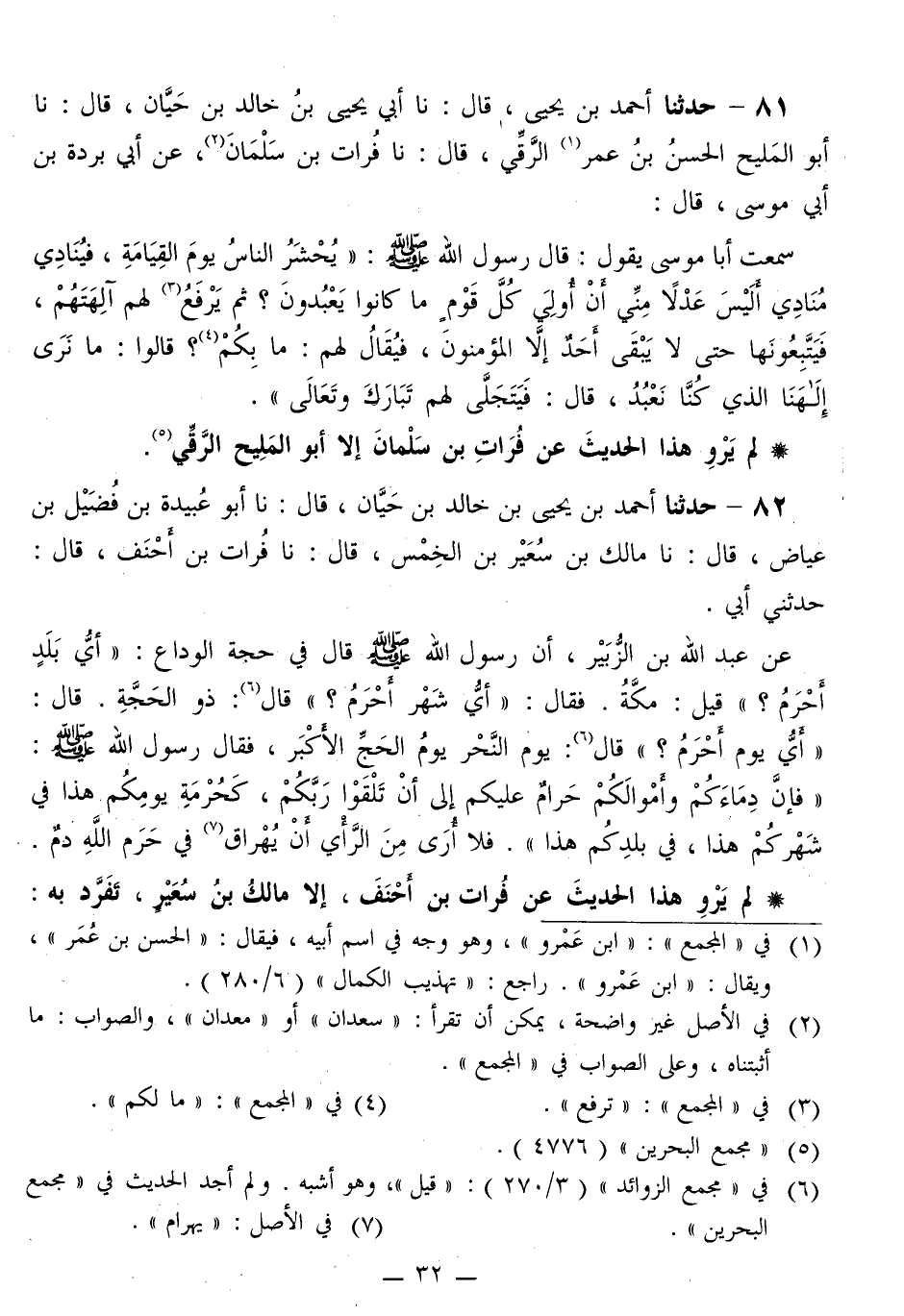 82 - حَدَّثَنَا أَحْمَدُ بْنُ يَحْيَى بْنِ خَالِدِ بْنِ حَيَّانَ قَالَ: نا أَبُو عُبَيْدَةَ بْنُ فُضَيْلِ بْنِ عِيَاضٍ قَالَ: نا مَالِكُ بْنُ سُعَيْرِ بْنِ الْخِمْسِ قَالَ: نا فُرَاتُ بْنُ أَحْنَفَ قَالَ: حَدَّثَنِي أَبِي، عَنْ عَبْدِ اللَّهِ بْنِ الزُّبَيْرِ، أَنَّ رَسُولَ اللَّهِ صَلَّى اللهُ عَلَيْهِ وَسَلَّمَ قَالَ فِي حَجَّةِ الْوَدَاعِ: «أَيُّ بَلَدِ أَحْرَمُ؟» قِيلَ: مَكَّةُ. فَقَالَ: «أَيُّ شَهْرٍ أَحْرَمُ؟» قَالَ: ذُو الْحِجَّةِ. قَالَ: «أَيُّ يَوْمٍ أَحْرَمُ؟» قَالَ: يَوْمُ النَّحْرِ يَوْمُ الْحَجِّ الْأَكْبَرِ، فَقَالَ رَسُولُ اللَّهِ صَلَّى اللهُ عَلَيْهِ وَسَلَّمَ: «فَإِنَّ §دِمَاءَكُمْ وَأَمْوَالَكُمْ حَرَامٌ عَلَيْكُمْ إِلَى أَنْ تَلْقَوْا رَبَّكُمْ، كَحُرْمَةِ يَوْمِكُمْ هَذَا فِي شَهْرِكُمْ هَذَا، فِي بَلَدِكُمْ هَذَا» . فَلَا أَرَى مِنَ الرَّأْيِ أَنْ يُهَرَاقَ فِي حَرَمِ اللَّهِ دَمٌ لَمْ يَرْوِ هَذَا الْحَدِيثَ عَنْ فُرَاتِ بْنِ أَحْنَفَ، إِلَّا مَالِكُ بْنُ سُعَيْرٍ، تَفَرَّدَ بِهِ: -[33]- أَبُو عُبَيْدَةَ، وَلَا يُرْوَى عَنِ ابْنِ الزُّبَيْرِ إِلَّا بِهَذَا الْإِسْنَادِ.