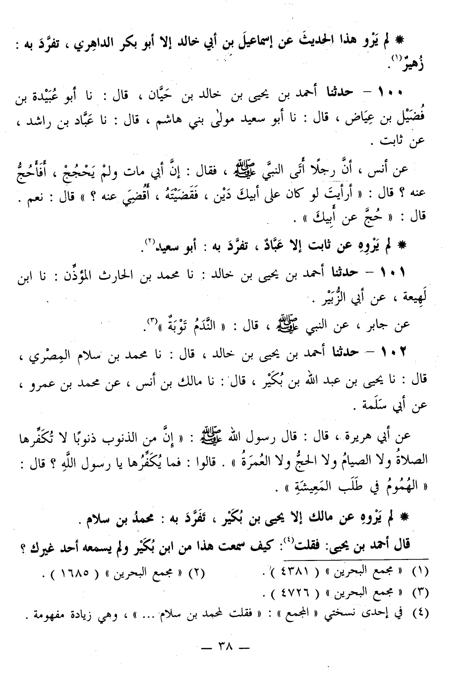 102 - حَدَّثَنَا أَحْمَدُ بْنُ يَحْيَى بْنِ خَالِدٍ قَالَ: نا مُحَمَّدُ بْنُ سَلَّامٍ الْمِصْرِيُّ قَالَ: نا يَحْيَى بْنُ عَبْدِ اللَّهِ بْنِ بُكَيْرٍ قَالَ: نا مَالِكُ بْنُ أَنَسٍ، عَنْ مُحَمَّدِ بْنِ عَمْرٍو، عَنْ أَبِي سَلَمَةَ، عَنْ أَبِي هُرَيْرَةَ قَالَ: قَالَ رَسُولُ اللَّهِ صَلَّى اللهُ عَلَيْهِ وَسَلَّمَ: «إِنَّ §مِنَ الذُّنُوبِ ذَنُوبًا لَا تُكَفِّرُهَا الصَّلَاةُ وَلَا الصِّيَامُ وَلَا الْحَجُّ وَلَا الْعُمْرَةُ» قَالُوا: فَمَا يُكَفِّرُهَا يَا رَسُولَ اللَّهِ؟ قَالَ: «الْهُمُومُ فِي طَلَبِ الْمَعِيشَةِ»
