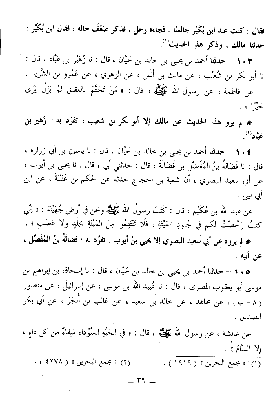 105 - حَدَّثَنَا أَحْمَدُ بْنُ يَحْيَى بْنِ خَالِدِ بْنِ حَيَّانَ قَالَ: نا إِسْحَاقُ بْنُ إِبْرَاهِيمَ بْنِ مُوسَى أَبُو يَعْقُوبَ الْمِصْرِيُّ قَالَ: نا عُبَيْدُ اللَّهِ بْنُ مُوسَى، عَنْ إِسْرَائِيلَ، عَنْ مَنْصُورٍ، عَنْ مُجَاهِدٍ، عَنْ خَالِدِ بْنِ سَعِيدٍ، عَنْ غَالِبِ بْنِ أَبْجَرَ، عَنْ أَبِي بَكْرٍ الصِّدِّيقِ، عَنْ عَائِشَةَ، عَنْ رَسُولِ اللَّهِ صَلَّى اللهُ عَلَيْهِ وَسَلَّمَ قَالَ: «§فِي الْحِبَّةِ السَّوْدَاءِ شِفَاءٌ مِنْ كُلِّ دَاءٍ، إلِّا السَّامُ» -[40]- لَا يُرْوَى هَذَا الْحَدِيثُ عَنْ أَبِي بَكْرٍ عَنْ عَائِشَةَ إِلَّا بِهَذَا الْإِسْنَادِ، تَفَرَّدَ بِهِ: عُبَيْدُ اللَّهِ بْنُ مُوسَى