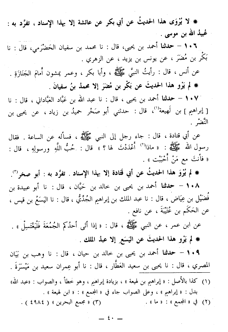 107 - حَدَّثَنَا أَحْمَدُ بْنُ يَحْيَى قَالَ: نا عَبْدُ اللَّهِ بْنُ عَبَّادٍ الْعَبَّادَانِيُّ قَالَ: نا إِبْرَاهِيمُ بْنُ لَهِيعَةَ قَالَ: حَدَّثَنِي أَبُو صَخْرٍ حُمَيْدُ بْنُ زِيَادٍ، عَنْ يَحْيَى بْنِ النَّضْرِ، عَنْ أَبِي قَتَادَةَ قَالَ: جَاءَ رَجُلٌ إِلَى النَّبِيِّ صَلَّى اللهُ عَلَيْهِ وَسَلَّمَ، فَسَأَلَهُ عَنِ السَّاعَةِ. فَقَالَ رَسُولُ اللَّهِ صَلَّى اللهُ عَلَيْهِ وَسَلَّمَ: «§مَاذَا أَعْدَدْتَ لَهَا؟» قَالَ: حُبُّ اللَّهِ وَرَسُولِهِ قَالَ: «فَأَنْتَ مَعَ مَنْ أَحْبَبْتَ»