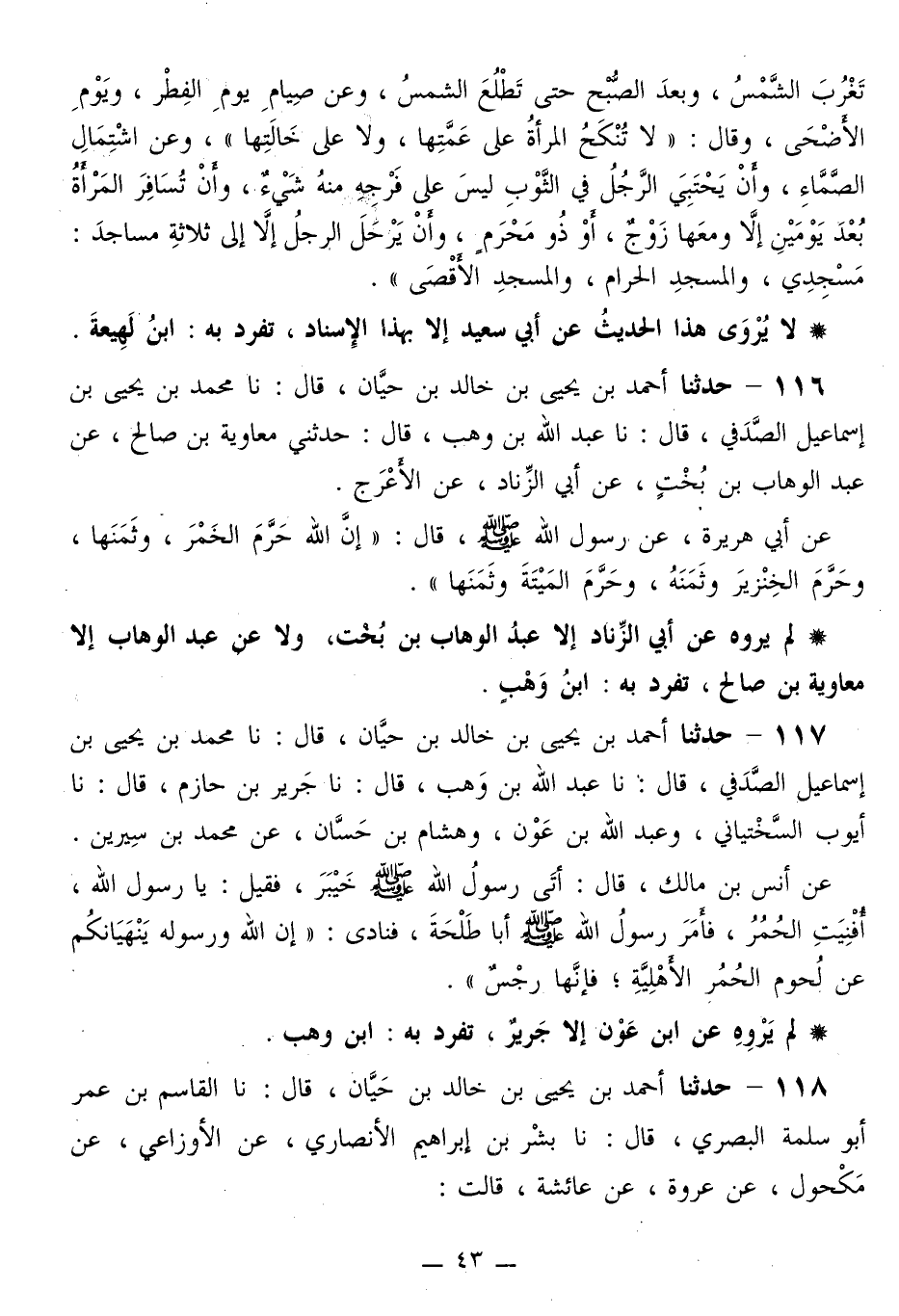 116 - حَدَّثَنَا أَحْمَدُ بْنُ يَحْيَى بْنِ خَالِدِ بْنِ حَيَّانَ قَالَ: نا مُحَمَّدُ بْنُ يَحْيَى بْنِ إِسْمَاعِيلَ الصَّدَفِيُّ قَالَ: نا عَبْدُ اللَّهِ بْنُ وَهْبٍ، قَالَ حَدَّثَنِي مُعَاوِيَةُ بْنُ صَالِحٍ، عَنْ عَبْدِ الْوَهَّابِ بْنِ بُخْتٍ، عَنْ أَبِي الزِّنَادِ، عَنِ الْأَعْرَجِ، عَنْ أَبِي هُرَيْرَةَ، عَنْ رَسُولِ اللَّهِ صَلَّى اللهُ عَلَيْهِ وَسَلَّمَ قَالَ: «إِنَّ §اللَّهَ حَرَّمَ الْخَمْرَ، وَثَمَنَهَا، وَحَرَّمَ الْخِنْزِيرَ وَثَمَنَهُ، وَحَرَّمَ الْمَيْتَةَ وَثَمَنَهَا»