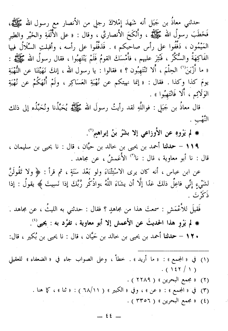 119 - حَدَّثَنَا أَحْمَدُ بْنُ يَحْيَى بْنِ خَالِدِ بْنِ حَيَّانَ قَالَ: نا يَحْيَى بْنُ سُلَيْمَانَ قَالَ: نا أَبُو مُعَاوِيَةَ قَالَ: نا الْأَعْمَشُ، عَنْ مُجَاهِدٍ، عَنِ ابْنِ عَبَّاسٍ، أَنَّهُ كَانَ «يَرَى الِاسْتِثْنَاءَ وَلَوْ بَعْدَ سَنَةٍ» ، ثُمَّ قَرَأَ: {§وَلَا تَقُولَنَّ لِشَيْءٍ إِنِّي فَاعِلٌ ذَلِكَ غَدًا إِلَّا أَنْ يَشَاءَ اللَّهُ وَاذْكُرْ رَبَّكَ إِذَا نَسِيتَ} [الكهف: 24] ، يَقُولُ: إِذَا ذَكَرَتْ فَقِيلَ لِلْأَعْمَشِ: سَمِعْتَ هَذَا مِنْ مُجَاهِدٍ؟ فَقَالَ: حَدَّثَنِي بِهِ اللَّيْثُ، عَنْ مُجَاهِدٍ لَمْ يَرْوِ هَذَا الْحَدِيثَ عَنِ الْأَعْمَشِ إِلَّا أَبُو مُعَاوِيَةَ، تَفَرَّدَ بِهِ: يَحْيَى