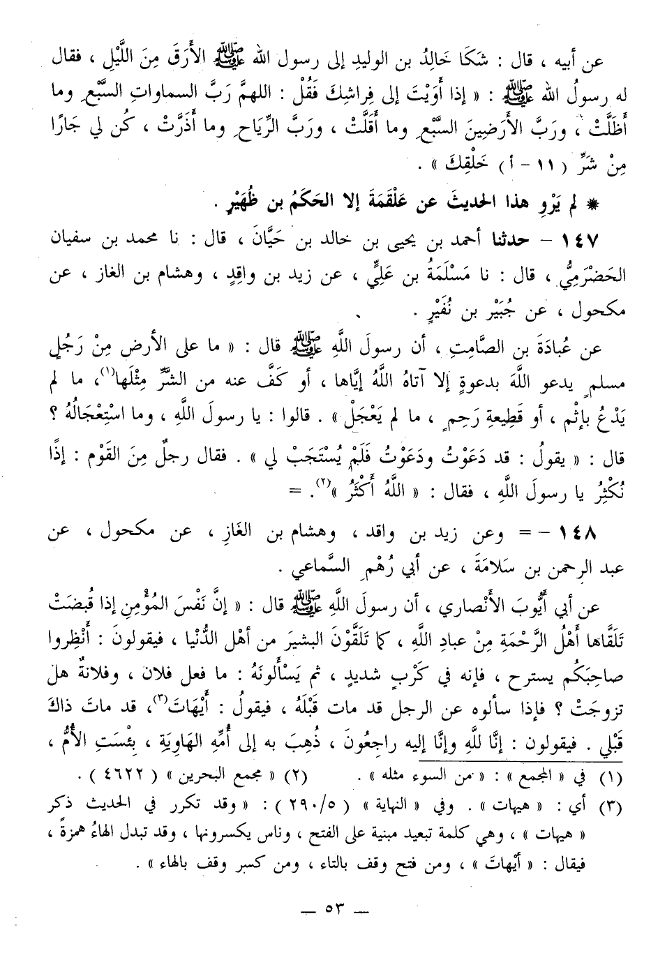 148 - وَعَنْ زَيْدِ بْنِ وَاقِدٍ، وَهِشَامِ بْنِ الْغَازِ، عَنْ مَكْحُولٍ، عَنِ عَبْدِ الرَّحْمَنِ بْنِ سَلَامَةَ، عَنْ أَبِي رُهْمٍ السَّمَاعِيِّ، عَنْ أَبِي أَيُّوبَ الْأَنْصَارِيِّ، أَنَّ رَسُولَ اللَّهِ صَلَّى اللهُ عَلَيْهِ وَسَلَّمَ قَالَ: «إِنَّ §نَفْسَ الْمُؤْمِنِ إِذَا قُبِضَتْ تَلَقَّاهَا أَهْلُ الرَّحْمَةِ مِنْ عِبَادِ اللَّهِ، كَمَا تَلَقَّوْنَ الْبَشِيرَ مِنْ أَهْلِ الدُّنْيَا، فَيَقُولُونَ: أَنْظِرُوا صَاحِبَكُمْ يَسْتَرِيحُ، فَإِنَّهُ فِي كَرِبٍ شَدِيدٍ، ثُمَّ يَسْأَلُونَهُ: مَا فَعَلَ فُلَانٌ، وَفُلَانَةٌ هَلْ تَزَوَّجَتْ؟ فَإِذَا سَأَلُوهُ عَنِ الرَّجُلِ قَدْ مَاتَ قَبْلَهُ، فَيَقُولُ: أَيْهَاتَ، قَدْ مَاتَ ذَاكَ قَبْلِي. فَيَقُولُونَ: إِنَّا لِلَّهِ وَإِنَّا إِلَيْهِ رَاجِعُونَ، ذُهِبَ بِهِ إِلَى أُمِّهِ الْهَاوِيَةِ، بِئْسَتِ الْأُمُّ، -[54]- وَبِئْسَتِ الْمُرَبِّيَةُ» . وَقَالَ: «إِنَّ أَعْمَالَكُمْ تُعْرَضُ عَلَى أَقَارِبِكُمْ، وَعَشَائِرِكُمْ مِنْ أَهْلِ الْآخِرَةِ، فَإِنْ كَانَ خَيْرًا فَرِحُوا وَاسْتَبْشَرُوا، وَقَالُوا: اللَّهُمَّ هَذَا فَضْلُكَ وَرَحْمَتُكَ، فَأَتْمِمْ نِعْمَتَكَ عَلَيْهِ، وَأَمِتْهُ عَلَيْهَا. وَيُعْرَضُ عَلَيْهِمْ عَمَلُ الْمُسِيءِ، فَيَقُولُونَ: اللَّهُمَّ أَلْهِمْهُ عَمَلًا صَالِحًا تَرْضَى بِهِ، وتُقَرِّبُهُ إِلَيْكَ» . لَمْ يَرْوِ هَذَيْنِ الْحَدِيثَيْنِ عَنْ مَكْحُولٍ إِلَّا زَيْدُ بْنُ وَاقِدٍ، وَهِشَامُ بْنُ الْغَازِ، تَفَرَّدَ بِهِمَا مَسْلَمَةُ بْنُ عُلَيٍّ