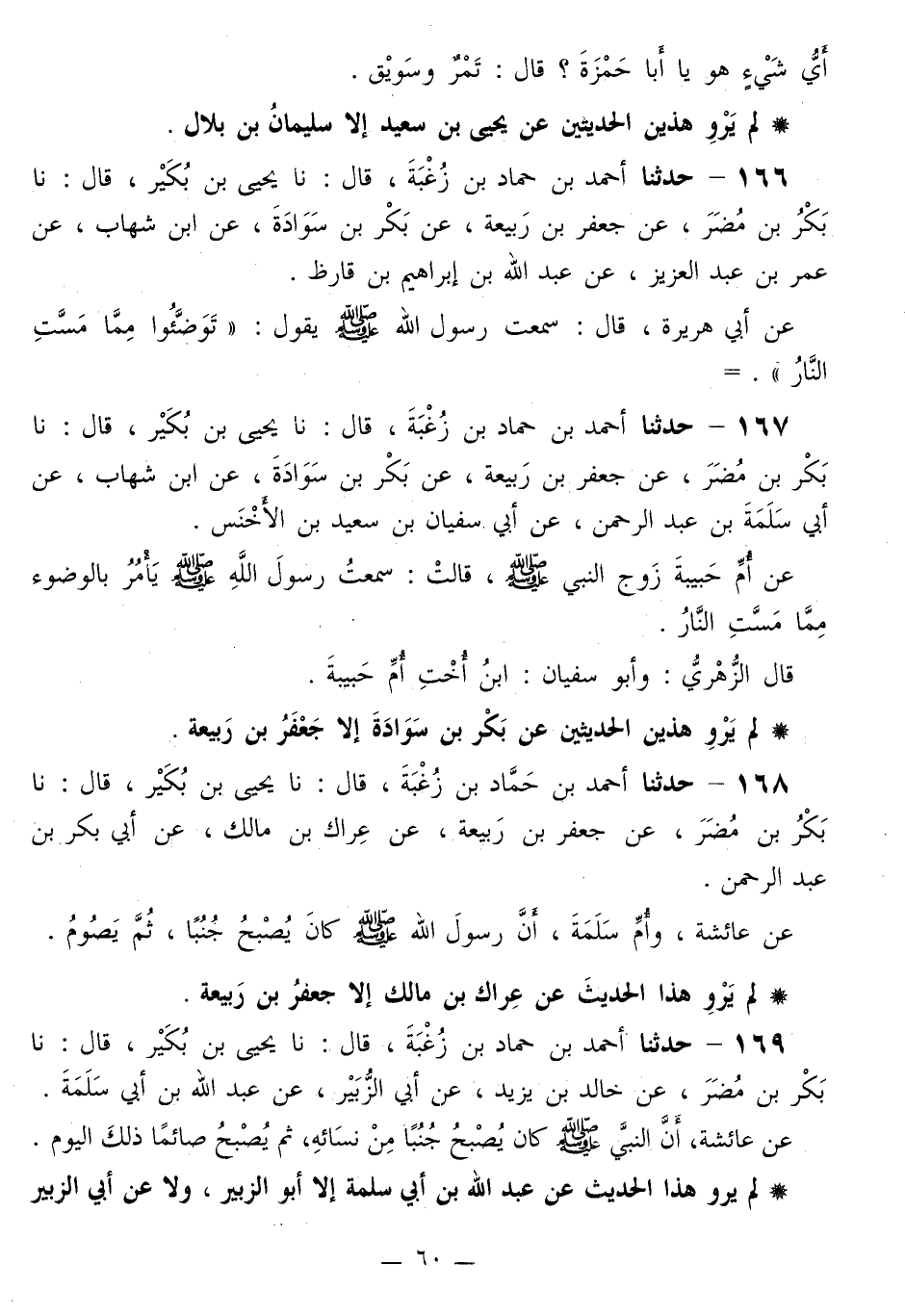 167 - حَدَّثَنَا أَحْمَدُ بْنُ حَمَّادِ بْنِ زُغْبَةَ قَالَ: نا يَحْيَى بْنُ بُكَيْرٍ قَالَ: نا بَكْرُ بْنُ مُضَرَ، عَنْ جَعْفَرِ بْنِ رَبِيعَةَ، عَنْ بَكْرِ بْنِ سَوَادَةَ، عَنِ ابْنِ شِهَابٍ، عَنْ أَبِي سَلَمَةَ بْنِ عَبْدِ الرَّحْمَنِ، عَنْ أَبِي سُفْيَانَ بْنِ سَعِيدِ بْنِ الْأَخْنَسِ، عَنْ أُمِّ حَبِيبَةَ زَوْجِ النَّبِيِّ صَلَّى اللهُ عَلَيْهِ وَسَلَّمَ، قَالَتْ: سَمِعْتُ رَسُولَ اللَّهِ صَلَّى اللهُ عَلَيْهِ وَسَلَّمَ «§يَأْمُرُ بِالْوَضُوءِ مِمَّا مَسَّتِ النَّارُ» . قَالَ الزُّهْرِيُّ: وأَبُو سُفْيَانَ: ابْنُ أُخْتِ أُمِّ حَبِيبَةَ. لَمْ يَرْوِ هَذَيْنِ الْحَدِيثَيْنِ عَنْ بَكْرِ بْنِ سَوَادَةَ إِلَّا جَعْفَرُ بْنُ رَبِيعَةَ