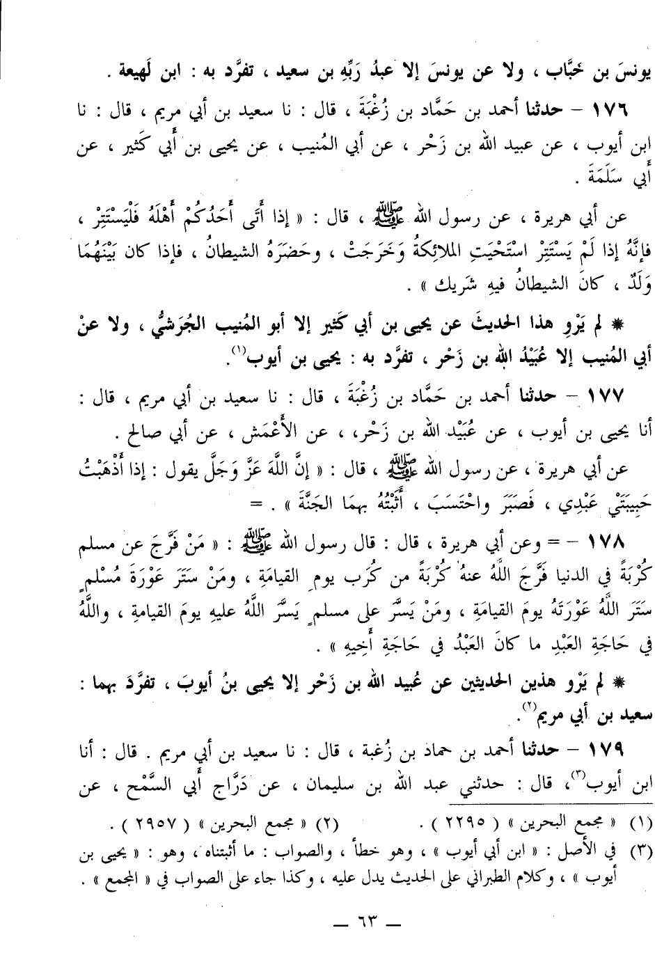 177 - حَدَّثَنَا أَحْمَدُ بْنُ حَمَّادِ بْنِ زُغْبَةَ قَالَ: نا سَعِيدُ بْنُ أَبِي مَرْيَمَ قَالَ: أَنَا يَحْيَى بْنُ أَيُّوبَ، عَنْ عُبَيْدِ اللَّهِ بْنِ زَحْرٍ، عَنِ الْأَعْمَشِ، عَنْ أَبِي صَالِحٍ، عَنْ أَبِي هُرَيْرَةَ، عَنْ رَسُولِ اللَّهِ صَلَّى اللهُ عَلَيْهِ وَسَلَّمَ قَالَ: «إِنَّ اللَّهَ عَزَّ وَجَلَّ يَقُولُ: §إِذَا أَذْهَبْتُ حَبِيبَتَيْ عَبْدِي، فَصَبَرَ وَاحْتَسَبَ، أَثَبْتُهُ بِهِمَا الْجَنَّةَ»