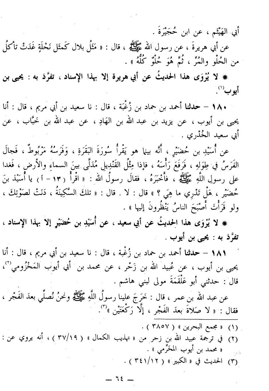180 - حَدَّثَنَا أَحْمَدُ بْنُ حَمَّادِ بْنِ زُغْبَةَ قَالَ: نا سَعِيدُ بْنُ أَبِي مَرْيَمَ قَالَ: أَنَا يَحْيَى بْنُ أَيُّوبَ، عَنْ يَزِيدَ بْنِ عَبْدِ اللَّهِ بْنِ الْهَادِ، عَنْ عَبْدِ اللَّهِ بْنِ خَبَّابٍ، عَنْ أَبِي سَعِيدٍ الْخُدْرِيِّ، عَنْ أُسَيْدِ بْنِ حُضَيْرٍ، أَنَّهُ بَيْنَمَا هُوَ يُقْرَأُ سُورَةَ الْبَقَرَةِ، وَفَرَسُهُ مَرْبُوطٌ، فَجَالَ الْفَرَسُ فِي طِوَلِهِ، فَرَفَعَ رَأْسَهُ، فَإِذَا مِثْلُ الْقِنْدِيلِ مُدَلًّى بَيْنَ السَّمَاءِ وَالْأَرْضِ، فَغَدَا عَلَى رَسُولِ اللَّهِ صَلَّى اللهُ عَلَيْهِ وَسَلَّمَ، فَأَخْبَرَهُ، فَقَالَ رَسُولُ اللَّهِ: «اقْرَأْ يَا أُسَيْدُ بْنُ حُضَيْرٍ، هَلْ تَدْرِي مَا هِيَ؟» قَالَ: لَا. قَالَ: «§تِلْكَ السَّكِينَةُ، دَنَتْ لِصَوْتِكَ، وَلَوْ قَرَأْتَ أَصْبَحَ النَّاسُ يَنْظُرُونَ إِلَيْهَا»