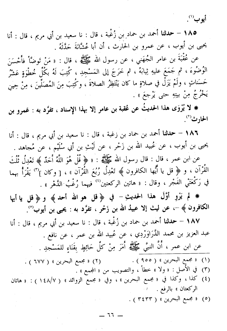 186 - حَدَّثَنَا أَحْمَدُ بْنُ حَمَّادِ بْنِ زُغْبَةَ قَالَ: نا سَعِيدُ بْنُ أَبِي مَرْيَمَ قَالَ: أَنَا يَحْيَى بْنُ أَيُّوبَ، عَنْ عُبَيْدِ اللَّهِ بْنِ زَحْرٍ، عَنْ لَيْثِ بْنِ أَبِي سُلَيْمٍ، عَنْ مُجَاهِدٍ، عَنِ ابْنِ عُمَرَ قَالَ: قَالَ رَسُولُ اللَّهِ صَلَّى اللهُ عَلَيْهِ وَسَلَّمَ: «§قُلْ هُوَ اللَّهُ أَحَدٌ تَعْدِلُ ثُلُثَ الْقُرْآنِ، وقُلْ يَا أَيُّهَا الْكَافِرُونَ تَعْدِلُ رُبُعَ الْقُرْآنِ» ، وَكَانَ يَقْرَأُ بِهِمَا فِي رَكْعَتَيِ الْفَجْرِ، وَقَالَ: «هَاتَانِ الرَّكْعَتَيْنِ فِيهِمَا رَغَبُ الدَّهْرِ» . لَمْ يَرْوِ أَوَّلَ هَذَا الْحَدِيثِ فِي قُلْ هُوَ اللَّهُ أَحَدٌ وقُلْ يَا أَيُّهَا الْكَافِرُونَ، عَنْ لَيْثٍ إِلَّا عُبَيْدُ اللَّهِ بْنُ زَحْرٍ، تَفَرَّدَ بِهِ: يَحْيَى بْنُ أَيُّوبَ