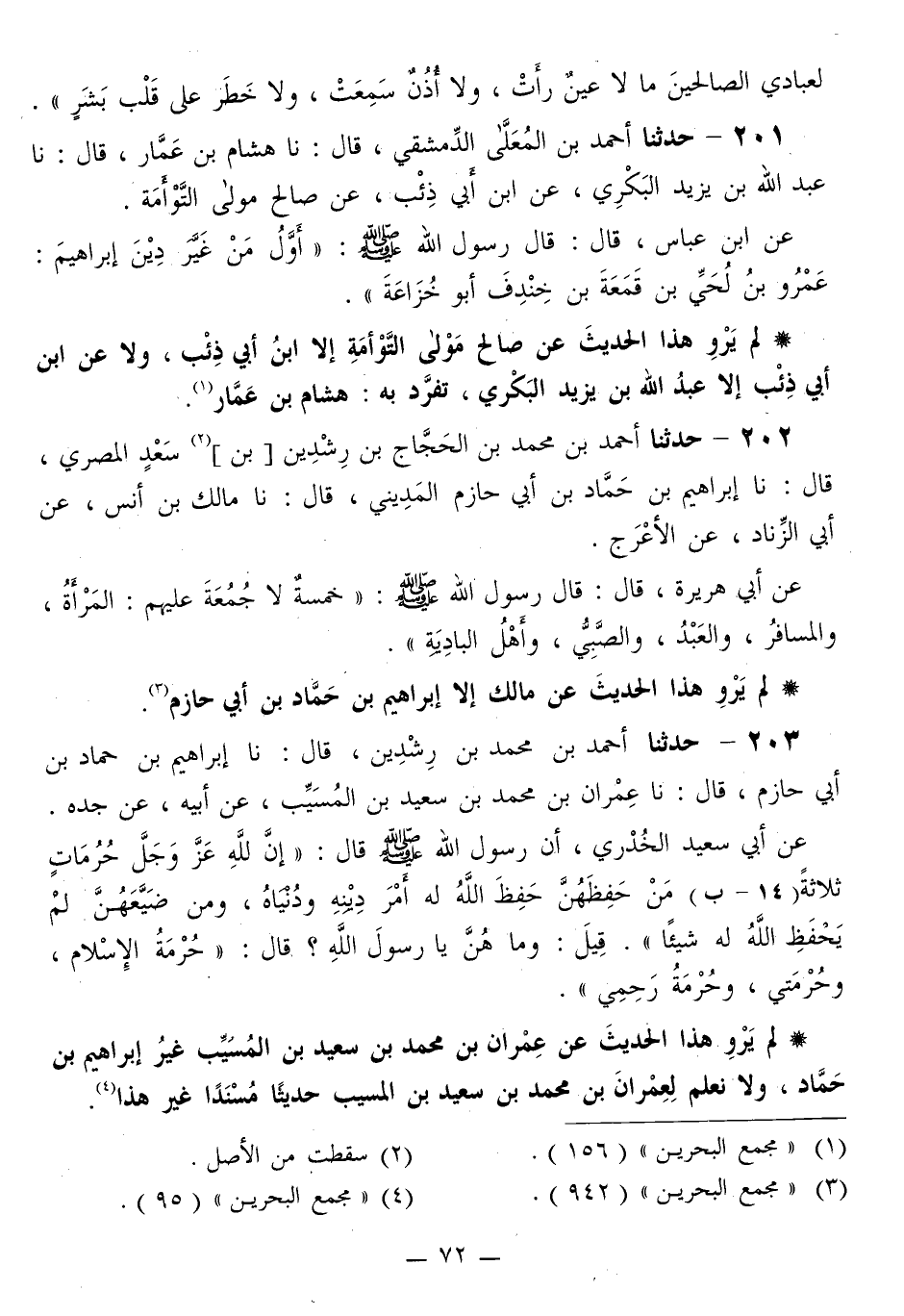 201 - حَدَّثَنَا أَحْمَدُ بْنُ الْمُعَلَّى الدِّمَشْقِيُّ قَالَ: نا هِشَامُ بْنُ عَمَّارٍ قَالَ: نا عَبْدُ اللَّهِ بْنُ يَزِيدَ الْبَكْرِيُّ، عَنِ ابْنِ أَبِي ذِئْبٍ، عَنْ صَالِحٍ، مَوْلَى التَّوْأَمَةِ. عَنِ ابْنِ عَبَّاسٍ قَالَ: قَالَ رَسُولُ اللَّهِ صَلَّى اللهُ عَلَيْهِ وَسَلَّمَ: «§أَوَّلُ مَنْ غَيَّرَ دِينَ إِبْرَاهِيمَ: عَمْرُو بْنُ لُحَيِّ بْنِ قَمَعَةَ بْنِ خِنْدِفَ أَبُو خُزَاعَةَ»