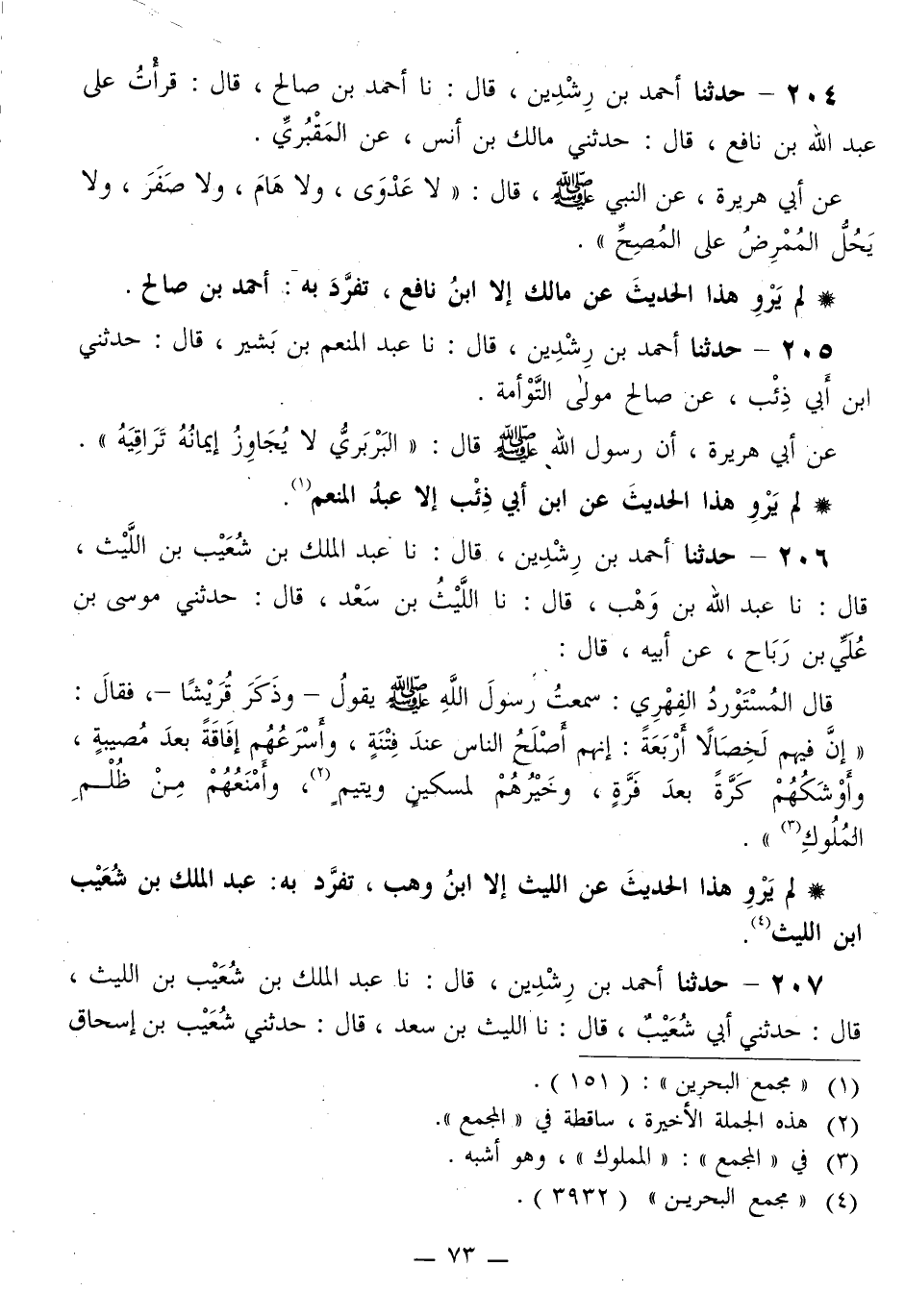 204 - حَدَّثَنَا أَحْمَدُ بْنُ رِشْدِينَ قَالَ: نا أَحْمَدُ بْنُ صَالِحٍ قَالَ: قَرَأْتُ عَلَى عَبْدِ اللَّهِ بْنِ نَافِعٍ قَالَ: حَدَّثَنِي مَالِكُ بْنُ أَنَسٍ، عَنِ الْمَقْبُرِيِّ، عَنْ أَبِي هُرَيْرَةَ، عَنِ النَّبِيِّ صَلَّى اللهُ عَلَيْهِ وَسَلَّمَ قَالَ: «§لَا عَدْوَى، وَلَا هَامَ، وَلَا صَفرَ، وَلَا يَحِلُّ الْمُمْرِضُ عَلَى الْمُصِحِّ»