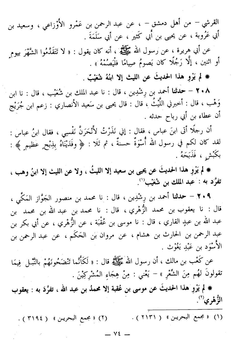 208 - حَدَّثَنَا أَحْمَدُ بْنُ رِشْدِينَ قَالَ: نا عَبْدُ الْمَلِكِ بْنُ شُعَيْبٍ قَالَ: نا ابْنُ وَهْبٍ قَالَ: أَخْبَرَنِي اللَّيْثُ قَالَ: قَالَ يَحْيَى بْنُ سَعِيدٍ الْأَنْصَارِيُّ: زَعَمَ ابْنُ جُرَيْجٍ، أَنَّ عَطَاءَ بْنَ أَبِي رَبَاحٍ، حَدَّثَهُ. أَنَّ رَجُلًا أَتَى ابْنَ عَبَّاسٍ، فَقَالَ: إِنِّي نَذَرْتُ لَأَنْحَرَنَّ نَفْسِي، فَقَالَ ابْنُ عَبَّاسٍ: «لَقَدْ كَانَ لَكُمْ فِي رَسُولِ اللَّهِ أُسْوَةٌ حَسَنَةٌ، ثُمَّ تَلَا: {§وفَدَينَاهُ بِذِبْحٍ عَظِيمٍ} [الصافات: 107] بِكَبْشٍ، فَذَبَحَهُ»