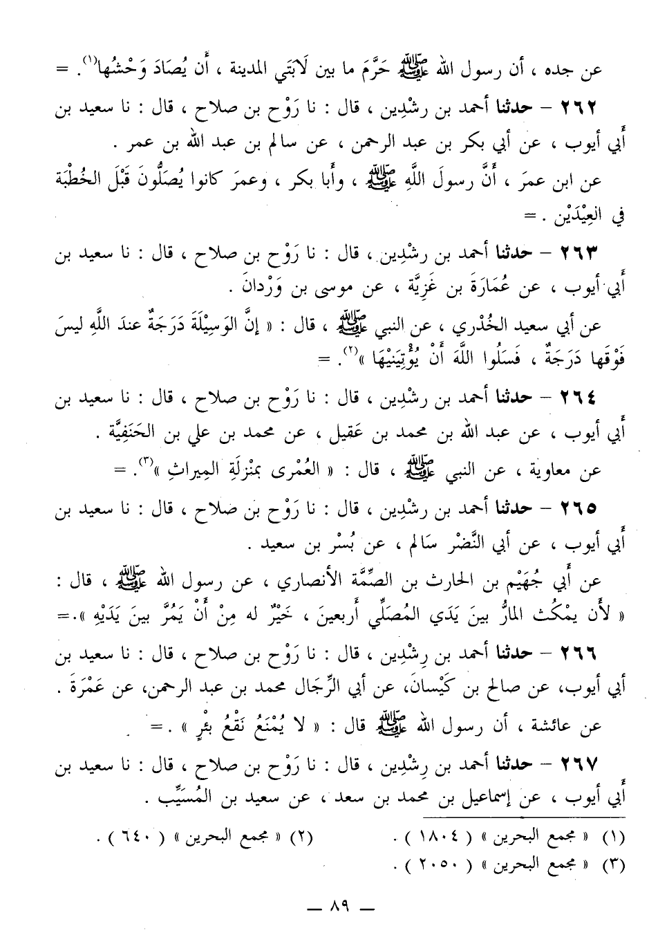 263 - حَدَّثَنَا أَحْمَدُ بْنُ رِشْدِينَ قَالَ: نا رَوْحُ بْنُ صَلَاحٍ قَالَ: نا سَعِيدُ بْنُ أَبِي أَيُّوبَ، عَنْ عُمَارَةَ بْنِ غَزِيَّةَ، عَنْ مُوسَى بْنِ وَرْدَانَ، عَنْ أَبِي سَعِيدٍ الْخُدْرِيِّ، عَنِ النَّبِيِّ صَلَّى اللهُ عَلَيْهِ وَسَلَّمَ قَالَ: «إِنَّ §الْوَسِيلَةَ دَرَجَةٌ عِنْدَ اللَّهِ لَيْسَ فَوْقَهَا دَرَجَةٌ، فَسَلُوا اللَّهَ أَنْ يُؤْتِينِيهَا»