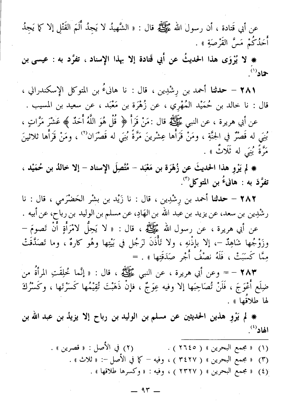 281 - حَدَّثَنَا أَحْمَدُ بْنُ رِشْدِينَ قَالَ: نا هَانِئُ بْنُ الْمُتَوَكِّلِ الْإِسْكَنْدَرَانِيُّ قَالَ: نا خَالِدُ بْنُ حُمَيْدٍ الْمَهْرِيُّ، عَنْ زُهْرَةَ بْنِ مَعْبَدٍ، عَنْ سَعِيدِ بْنِ الْمُسَيِّبِ، عَنْ أَبِي هُرَيْرَةَ، عَنِ النَّبِيِّ صَلَّى اللهُ عَلَيْهِ وَسَلَّمَ قَالَ: «§مَنْ قَرَأَ قُلْ هُوَ اللَّهُ أَحَدٌ عَشْرَ مَرَّاتٍ بُنِيَ لَهُ قَصْرٌ فِي الْجَنَّةِ، وَمَنْ قَرَأَهَا عِشْرِينَ مَرَّةً بُنِيَ لَهُ قَصْرَانِ، وَمَنْ قَرَأَهَا ثَلَاثِينَ مَرَّةً بُنِيَ لَهُ ثَلَاثٌ»