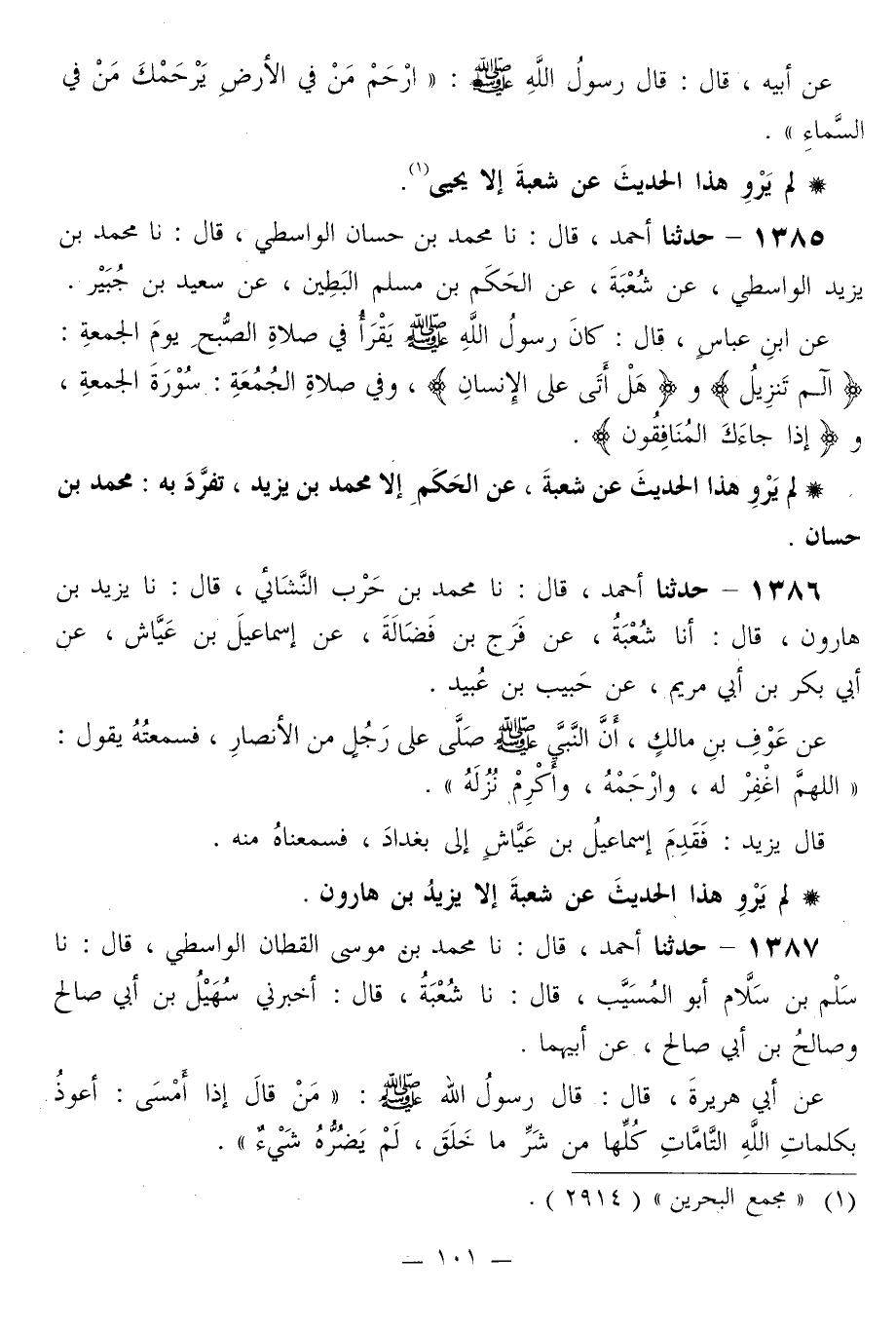 1385 - حَدَّثَنَا أَحْمَدُ قَالَ: نا مُحَمَّدُ بْنُ حَسَّانَ الْوَاسِطِيُّ قَالَ: نا مُحَمَّدُ بْنُ يَزِيدَ الْوَاسِطِيُّ، عَنْ شُعْبَةَ، عَنِ الْحَكَمِ، عَنِ مُسْلِمٍ الْبَطِينِ، عَنْ سَعِيدِ بْنِ جُبَيْرٍ، عَنِ ابْنِ عَبَّاسٍ قَالَ: «كَانَ رَسُولُ اللَّهِ صَلَّى اللهُ عَلَيْهِ وَسَلَّمَ §يُقْرَأُ فِي صَلَاةِ الصُّبْحِ يَوْمَ الْجُمُعَةِ: الم تَنْزِيلُ وهَلْ أَتَى عَلَى الْإِنْسَانِ، وَفِي صَلَاةِ الْجُمُعَةِ: سُورَةَ الْجُمُعَةِ، وَإِذَا جَاءَكَ الْمُنَافِقُونَ»