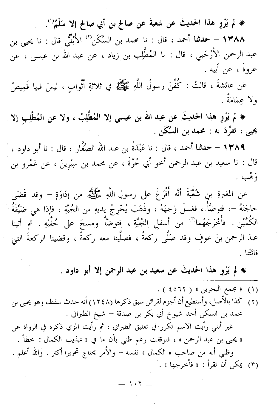 1388 - حَدَّثَنَا أَحْمَدُ قَالَ: نا مُحَمَّدُ بْنُ السَّكَنِ الْأُبُلِّيُّ قَالَ: نا يَحْيَى بْنُ عَبْدِ الرَّحْمَنِ الْأَرْحَبِيُّ قَالَ: نا الْمُطَّلِبُ بْنُ زِيَادٍ، عَنْ عَبْدِ اللَّهِ بْنِ عِيسَى، عَنْ عُرْوَةَ، عَنْ أَبِيهِ، عَنْ عَائِشَةَ قَالَتْ: «§كُفِّنَ رَسُولُ اللَّهِ صَلَّى اللهُ عَلَيْهِ وَسَلَّمَ فِي ثَلَاثَةِ أَثْوَابٍ، لَيْسَ فِيهَا قَمِيصٌ وَلَا عِمَامَةٌ»