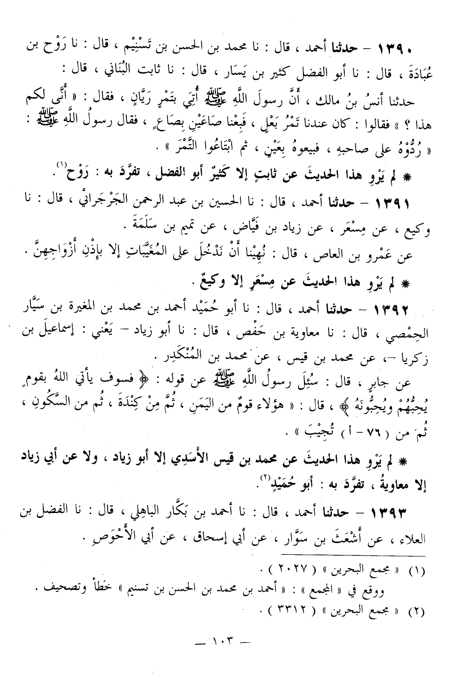 1390 - حَدَّثَنَا أَحْمَدُ قَالَ: نا مُحَمَّدُ بْنُ الْحَسَنِ بْنِ تَسْنِيمٍ قَالَ: نا رَوْحُ بْنُ عُبَادَةَ قَالَ: نا أَبُو الْفَضْلِ كَثِيرُ بْنُ يَسَارٍ قَالَ: نا ثََابِتٌ الْبُنَانِيُّ قَالَ: حَدَّثَنَا أَنَسُ بْنُ مَالِكٍ، أَنَّ رَسُولَ اللَّهِ صَلَّى اللهُ عَلَيْهِ وَسَلَّمَ أُتِيَ بِتَمْرٍ رَيَّانٍ، فَقَالَ: «أَنَّى لَكُمْ هَذَا؟» فَقَالُوا: كَانَ عِنْدَنَا تَمْرُ بَعْلٍ، فَبِعْنَا صَاعَيْنِ بِصَاعٍ، فَقَالَ رَسُولُ اللَّهِ صَلَّى اللهُ عَلَيْهِ وَسَلَّمَ: «§رُدُّوهُ عَلَى صَاحِبِهِ، فَبِيعُوهُ بِعَيْنٍ، ثُمَّ ابْتَاعُوا التَّمْرَ»