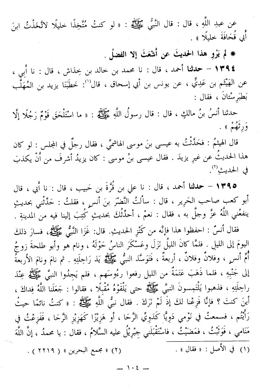 1395 - حَدَّثَنَا أَحْمَدُ قَالَ: نا عَلِيُّ بْنُ قُرَّةَ بْنِ حَبِيبٍ قَالَ: نا أَبِي قَالَ: أَبُو كَعْبٍ صَاحِبُ الْحَرِيرِ قَالَ: سَأَلْتُ النَّضْرَ بْنَ أَنَسٍ، فَقُلْتُ: حَدِّثْنِي بِحَدِيثٍ، يَنْفَعُنِي اللَّهُ عَزَّ وَجَلَّ بِهِ، فَقَالَ: نَعَمْ، أُحَدِّثُكَ بِحَدِيثٍ كُتِبَ إِلَيْنَا فِيهِ مِنَ الْمَدِينَةِ. فَقَالَ أَنَسٌ: احْفَظُوا هَذَا فَإِنَّهُ مِنْ كَنْزِ الْحَدِيثِ. قَالَ: غَزَا النَّبِيُّ صَلَّى اللهُ عَلَيْهِ وَسَلَّمَ، فَسَارَ ذَلِكَ الْيَوْمَ إِلَى اللَّيْلِ. فَلَمَّا كَانَ اللَّيْلُ نَزَلَ وَعَسْكَرَ النَّاسُ حَوْلَهُ، وَنَامَ هُوَ وَأَبُو طَلْحَةَ زَوْجُ أُمِّ أَنَسٍ، وَفُلَانٌ وَفُلَانٌ، أَرْبَعَةٌ، فَتَوَسَّدَ النَّبِيُّ صَلَّى اللهُ عَلَيْهِ وَسَلَّمَ يَدَ رَاحِلَتِهِ. ثُمَّ نَامَ وَنَامَ الْأَرْبَعَةُ إِلَى جَنْبِهِ، فَلَمَّا ذَهَبَ عَتَمَةٌ مِنَ اللَّيْلِ رَفَعُوا رُءُوسَهُمْ، فَلَمْ يَجِدُوا النَّبِيَّ صَلَّى اللهُ عَلَيْهِ وَسَلَّمَ عِنْدَ رَاحِلَتِهِ، فَذَهَبُوا يَلْتَمِسُونَ النَّبِيَّ صَلَّى اللهُ عَلَيْهِ وَسَلَّمَ حَتَّى يَلْقَوْهُ مُقْبِلًا، فَقَالُوا: جَعَلَنَا اللَّهُ فِدَاكَ، أَيْنَ كُنْتَ؟ فَإِنَّا فَزِعْنَا لَكَ إِذْ لَمْ نَرَكَ. فَقَالَ نَبِيُّ اللَّهِ صَلَّى اللهُ عَلَيْهِ وَسَلَّمَ: «كُنْتُ نَائِمًا حَيْثُ رَأَيْتُمْ، فَسَمِعْتُ فِي نَوْمِي دَوِيًّا كَدَوِيِّ الرَّحَا، أَوْ هَزِيزًا كَهَزِيزِ الرَّحَا، فَفَزِعْتُ فِي مَنَامِي، فَوَثَبْتُ، فَمَضَيْتُ، فَاسْتَقْبَلَنِي جِبْرِيلُ عَلَيْهِ السَّلَامُ، فَقَالَ: يَا مُحَمَّدُ، إِنَّ §اللَّهَ