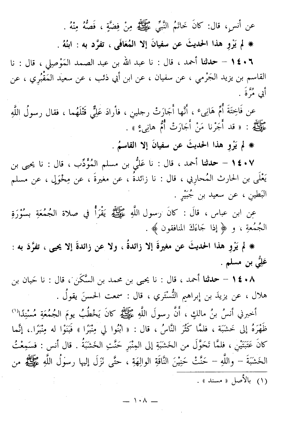 1408 - حَدَّثَنَا أَحْمَدُ قَالَ: نا يَحْيَى بْنُ مُحَمَّدِ بْنِ السَّكَنِ قَالَ: نا حَبَّانُ بْنُ هِلَالٍ، عَنْ يَزِيدَ بْنِ إِبْرَاهِيمَ التُّسْتَرِيِّ قَالَ: سَمِعْتُ الْحَسَنَ يَقُولُ: أَخْبَرَنِي أَنَسُ بْنُ مَالِكٍ، أَنَّ رَسُولَ اللَّهِ صَلَّى اللهُ عَلَيْهِ وَسَلَّمَ كَانَ يَخْطُبُ يَوْمَ الْجُمُعَةِ مُسْنِدًا ظَهْرَهُ إِلَى خَشَبَةٍ، فَلَمَّا كَثُرَ النَّاسُ قَالَ: «ابْنُوا لِي مِنْبَرًا» فَبَنَوْا لَهُ مِنْبَرًا، إِنَّمَا كَانَ عَتَبَتَيْنِ، فَلَمَّا تَحَوَّلَ مِنَ الْخَشَبَةِ إِلَى الْمِنْبَرِ حَنَّتِ الْخَشَبَةُ. قَالَ أَنَسٌ: فَسَمِعْتُ الْخَشَبَةَ وَاللَّهِ حَنَّتْ حَنِينَ النَّاقَةِ الْوَالِهَةِ، حَتَّى §نَزَلَ إِلَيْهَا رَسُولُ اللَّهِ صَلَّى اللهُ عَلَيْهِ وَسَلَّمَ مِنَ -[109]- الْمِنْبَرِ، فَاحْتَضَنَهَا، فَسَكَنَتْ «فَقَالَ الْحَسَنُ:» يَا عِبَادَ اللَّهِ الْمُسْلِمِينَ، الْخَشَبَةُ تَحِنُّ إِلَى رَسُولِ اللَّهِ صَلَّى اللهُ عَلَيْهِ وَسَلَّمَ شَوْقًا إِلَيْهِ، لِمَكَانِهِ إِلَيْهَا، أَفَلَيْسَ الرِّجَالُ الَّذِينَ يَرْجُونَ لِقَاءَهُ أَحَقُّ أَنْ يَشْتَاقُوا إِلَيْهِ؟ «