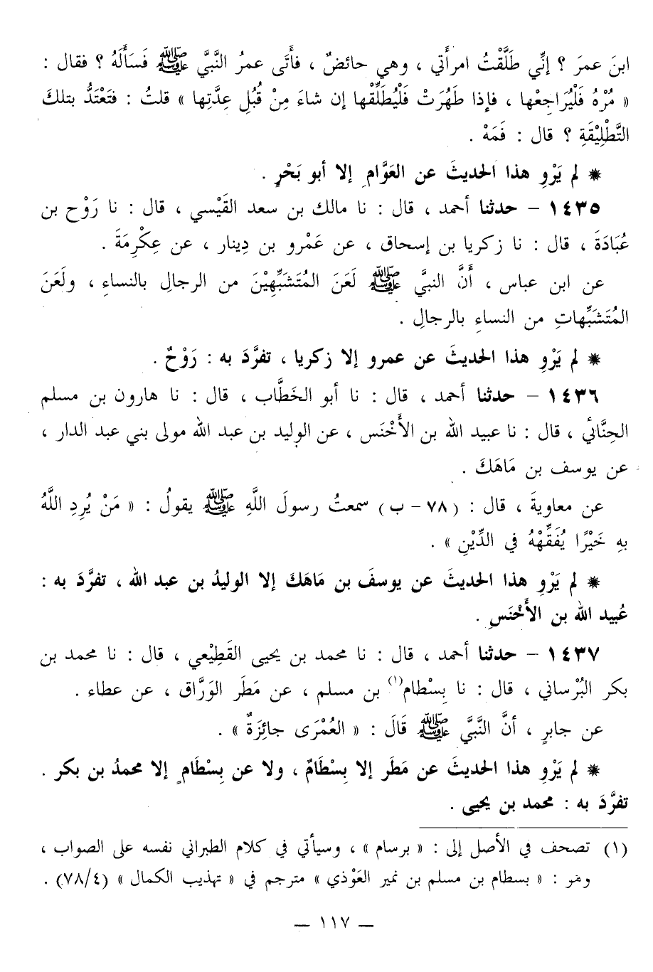 1435 - حَدَّثَنَا أَحْمَدُ قَالَ: نا مَالِكُ بْنُ سَعْدٍ الْقَيْسِيُّ قَالَ: نا رَوْحُ بْنُ عُبَادَةَ قَالَ: نا زَكَرِيَّا بْنُ إِسْحَاقَ، عَنْ عَمْرِو بْنِ دِينَارٍ، عَنْ عِكْرِمَةَ، عَنِ ابْنِ عَبَّاسٍ، «أَنَّ النَّبِيَّ صَلَّى اللهُ عَلَيْهِ وَسَلَّمَ §لَعَنَ الْمُتَشَبِّهِينَ مِنَ الرِّجَالِ بِالنِّسَاءِ، وَلَعَنَ الْمُتَشَبِّهَاتِ مِنَ النِّسَاءِ بِالرِّجَالِ»