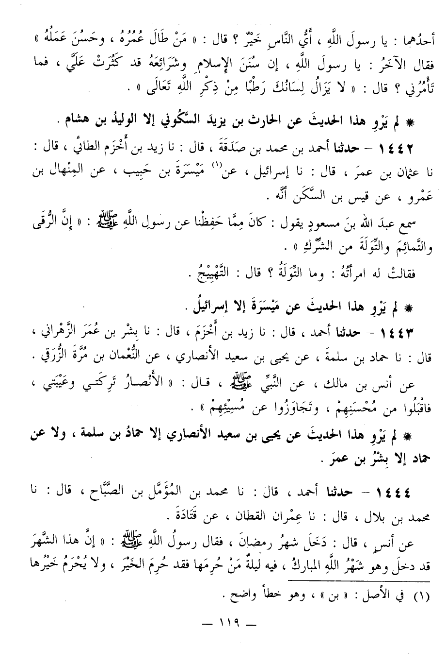 1444 - حَدَّثَنَا أَحْمَدُ قَالَ: نا مُحَمَّدُ بْنُ الْمُؤَمَّلِ بْنِ الصَّبَّاحِ قَالَ: نا مُحَمَّدُ بْنُ بِلَالٍ قَالَ: نا عِمْرَانَ الْقَطَّانُ، عَنْ قَتَادَةَ، عَنْ أَنَسٍ قَالَ: دَخَلَ شَهْرُ رَمَضَانَ، فَقَالَ رَسُولُ اللَّهِ صَلَّى اللهُ عَلَيْهِ وَسَلَّمَ: «إِنَّ §هَذَا الشَّهْرَ قَدْ دَخَلَ وَهُوَ شَهْرُ اللَّهِ الْمُبَارَكُ، فِيهِ لَيْلَةٌ مَنْ حُرِمَهَا فَقَدْ حُرِمَ الْخَيْرَ، وَلَا يُحْرَمُ خَيْرَهَا -[120]- إِلَّا كُلُّ مَحْرُومٍ»