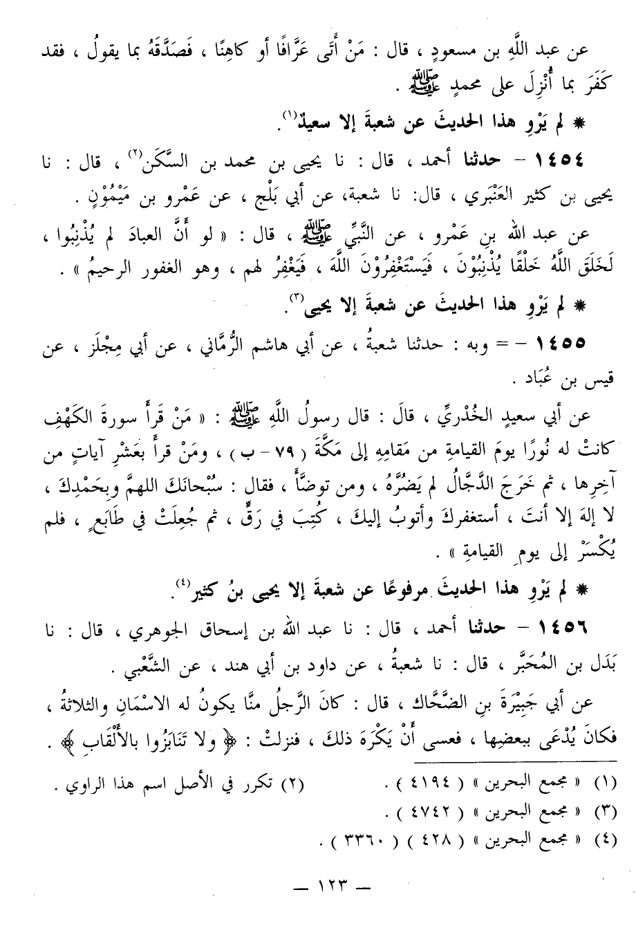 1455 - وَبِهِ: حَدَّثَنَا شُعْبَةُ، عَنْ أَبِي هَاشِمٍ الرُّمَّانِيِّ، عَنْ أَبِي مِجْلَزٍ، عَنْ قَيْسِ بْنِ عُبَادٍ، عَنْ أَبِي سَعِيدٍ الْخُدْرِيِّ قَالَ: قَالَ رَسُولُ اللَّهِ صَلَّى اللهُ عَلَيْهِ وَسَلَّمَ: «§مَنْ قَرَأَ سُورَةَ الْكَهْفِ كَانَتْ لَهُ نُورًا يَوْمَ الْقِيَامَةِ مِنْ مَقَامِهِ إِلَى مَكَّةَ، وَمَنْ قَرَأَ بِعَشْرِ آيَاتٍ مِنْ آخِرِهَا، ثُمَّ خَرَجَ الدَّجَّالُ لَمْ يَضُرَّهُ، وَمَنْ تَوَضَّأَ، فَقَالَ: سُبْحَانَكَ اللَّهُمَّ وَبِحَمْدِكَ، لَا إِلَهَ إِلَّا أَنْتَ، أَسْتَغْفِرُكَ وَأَتُوبُ إِلَيْكَ، كُتِبَ فِي رَقٍّ، ثُمَّ جُعِلَتْ فِي طَابَعٍ، فَلَمْ يُكْسَرْ إِلَى يَوْمِ الْقِيَامَةِ»