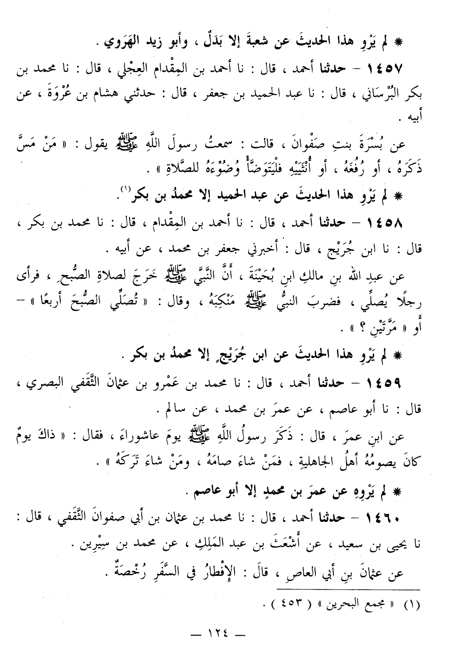 1457 - حَدَّثَنَا أَحْمَدُ قَالَ: نا أَحْمَدُ بْنُ الْمِقْدَامِ الْعِجْلِيُّ قَالَ: نا مُحَمَّدُ بْنُ بَكْرٍ الْبُرْسَانِيُّ قَالَ: نا عَبْدُ الْحَمِيدِ بْنُ جَعْفَرٍ قَالَ: حَدَّثَنِي هِشَامُ بْنُ عُرْوَةَ، عَنْ أَبِيهِ، عَنْ بُسْرَةَ بِنْتِ صَفْوَانَ قَالَتْ: سَمِعْتُ رَسُولَ اللَّهِ صَلَّى اللهُ عَلَيْهِ وَسَلَّمَ يَقُولُ: «§مَنْ مَسَّ ذَكَرَهُ، أَوْ رُفْغَهُ، أَوْ أُنْثَيَيْهِ فَلْيَتَوَضَّأْ وُضُوءَهُ لِلصَّلَاةِ»