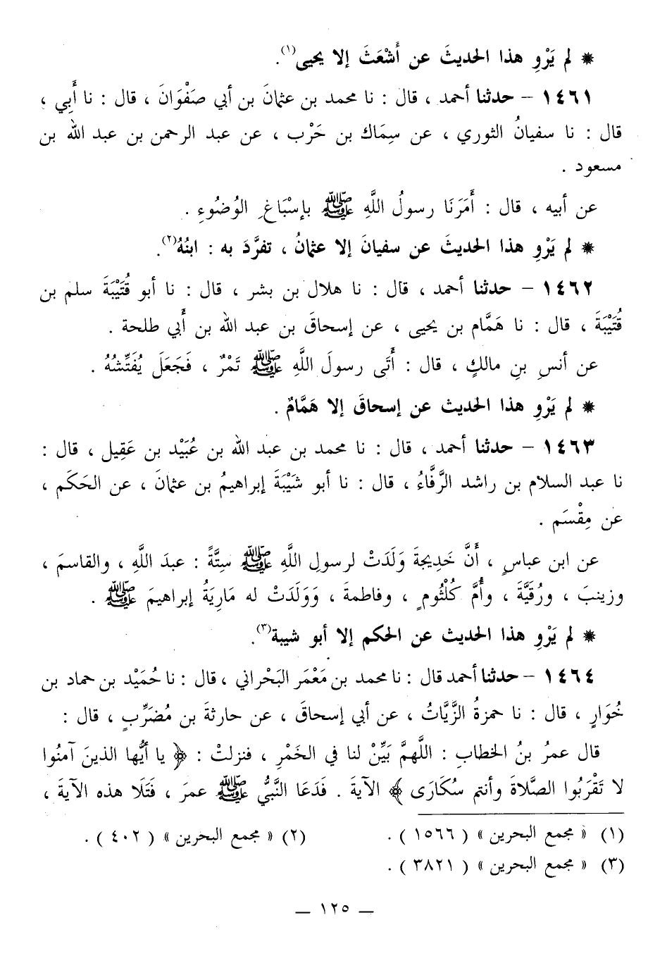 1463 - حَدَّثَنَا أَحْمَدُ قَالَ: نا مُحَمَّدُ بْنُ عَبْدِ اللَّهِ بْنِ عُبَيْدِ بْنِ عُقَيْلٍ قَالَ: نا عَبْدُ السَّلَامِ بْنُ رَاشِدٍ الرَّفَّاءُ قَالَ: نا أَبُو شَيْبَةَ إِبْرَاهِيمُ بْنُ عُثْمَانَ، عَنِ الْحَكَمِ، عَنْ مِقْسَمٍ، عَنِ ابْنِ عَبَّاسٍ، أَنَّ «§خَدِيجَةَ وَلَدَتْ لِرَسُولِ اللَّهِ صَلَّى اللهُ عَلَيْهِ وَسَلَّمَ سِتَّةً: عَبْدُ اللَّهِ، وَالْقَاسِمُ، وَزَيْنَبُ، وَرُقَيَّةُ، وَأُمُّ كُلْثُومٍ، وَفَاطِمَةُ، وَوَلَدَتْ لَهُ مَارِيَةُ إِبْرَاهِيمَ صَلَّى اللهُ عَلَيْهِ وَسَلَّمَ»