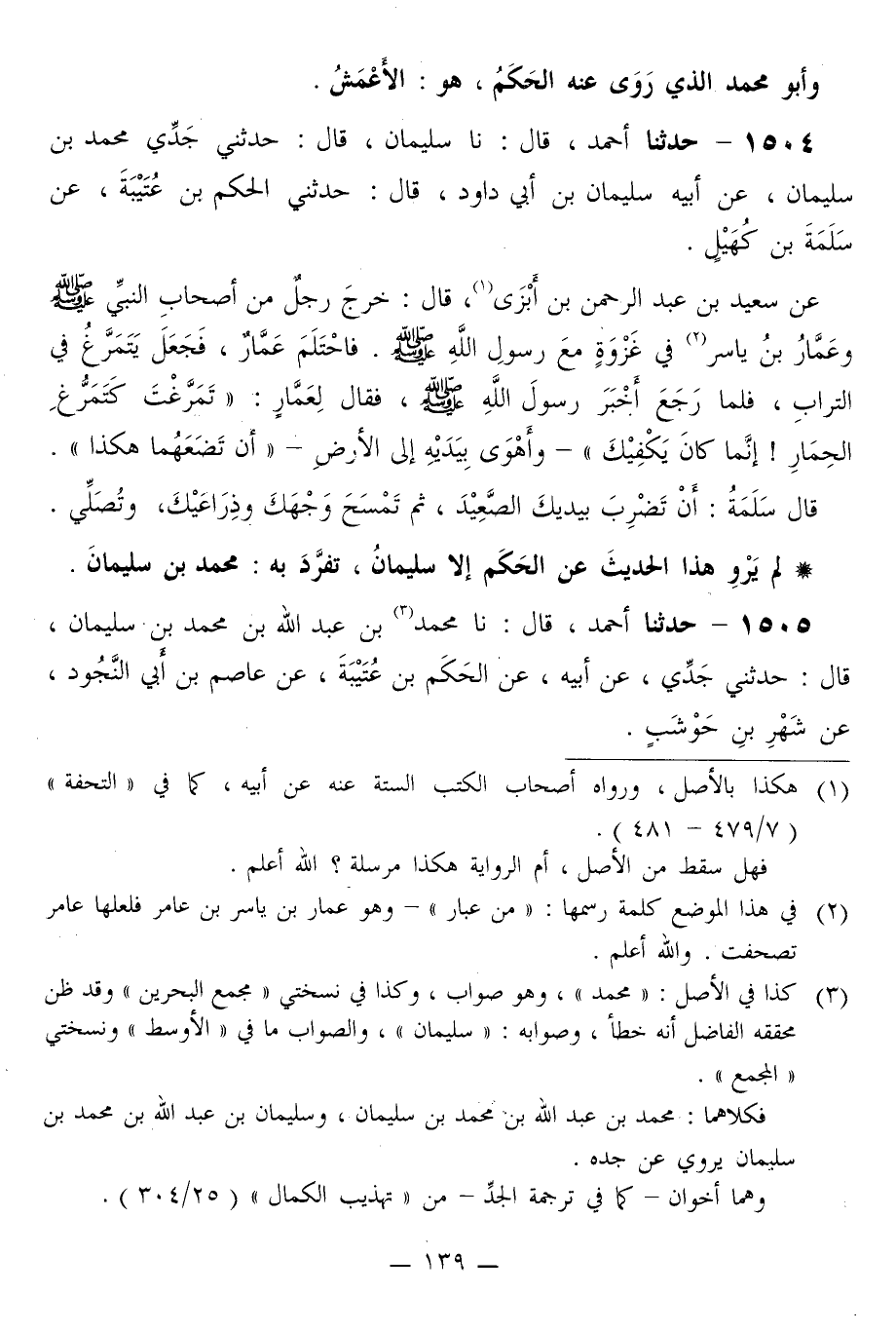 1504 - حَدَّثَنَا أَحْمَدُ قَالَ: نا سُلَيْمَانُ قَالَ: حَدَّثَنِي جَدِّي مُحَمَّدُ بْنُ سُلَيْمَانَ، عَنْ أَبِيهِ سُلَيْمَانَ بْنِ أَبِي دَاوُدَ قَالَ: حَدَّثَنِي الْحَكَمُ بْنُ عُتَيْبَةَ، عَنْ سَلَمَةَ بْنِ كُهَيْلٍ، عَنْ سَعِيدِ بْنِ عَبْدِ الرَّحْمَنِ بْنِ أَبْزَى قَالَ: خَرَجَ رَجُلٌ مِنْ أَصْحَابِ النَّبِيِّ صَلَّى اللهُ عَلَيْهِ وَسَلَّمَ وَعَمَّارُ بْنُ يَاسِرٍ فِي غَزْوَةٍ مَعَ رَسُولِ اللَّهِ صَلَّى اللهُ عَلَيْهِ وَسَلَّمَ. فَاحْتَلَمَ عَمَّارٌ، فَجَعَلَ يَتَمَرَّغُ فِي التُّرَابِ، فَلَمَّا رَجَعَ أَخْبَرَ رَسُولَ اللَّهِ صَلَّى اللهُ عَلَيْهِ وَسَلَّمَ، فَقَالَ لِعَمَّارٍ: «§تَمَرَّغْتُ كَتَمَرُّغِ الْحِمَارِ إِنَّمَا كَانَ يَكْفِيكَ» ، وَأَهْوَى بِيَدَيْهِ إِلَى الْأَرْضِ «أَنْ تَضَعَهُمَا هَكَذَا» قَالَ سَلَمَةُ: أَنْ تَضْرِبَ بِيَدَيْكَ الصَّعِيدَ، ثُمَّ تَمْسَحَ وَجْهَكَ وَذِرَاعَيْكَ، وَتُصَلِّيَ «