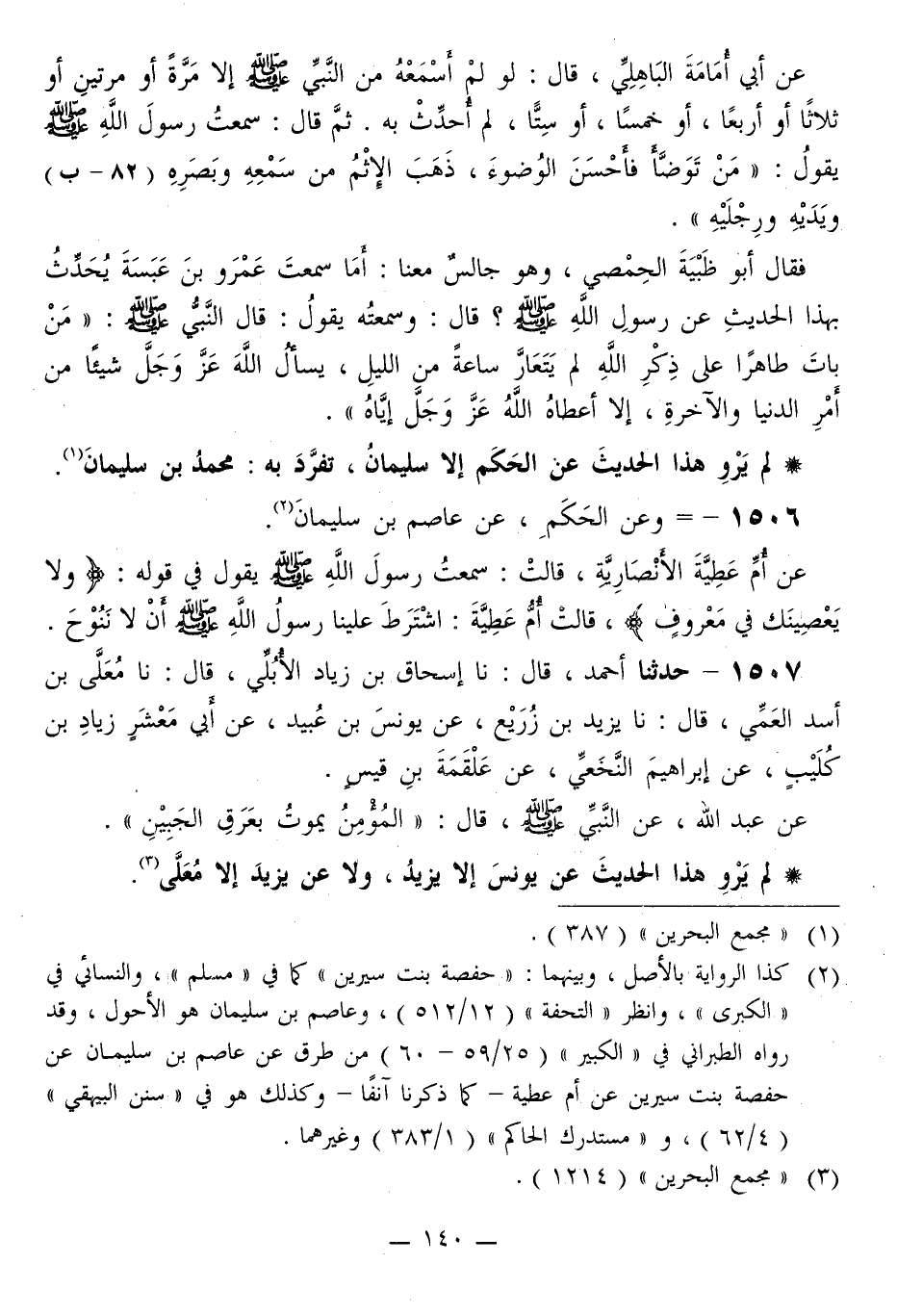 1507 - حَدَّثَنَا أَحْمَدُ قَالَ: نا إِسْحَاقُ بْنُ زِيَادٍ الْأُبُلِّيُّ قَالَ: نا مُعَلَّى بْنُ أَسَدٍ الْعَمِّيُّ قَالَ: نا يَزِيدُ بْنُ زُرَيْعٍ، عَنْ يُونُسَ بْنِ عُبَيْدٍ، عَنْ أَبِي مَعْشَرٍ زِيَادِ بْنِ كُلَيْبٍ، عَنْ إِبْرَاهِيمَ النَّخَعِيِّ، عَنْ عَلْقَمَةَ بْنِ قَيْسٍ، عَنْ عَبْدِ اللَّهِ، عَنِ النَّبِيِّ صَلَّى اللهُ عَلَيْهِ وَسَلَّمَ قَالَ: «§الْمُؤْمِنُ يَمُوتُ بِعَرَقِ الْجَبِينِ»
