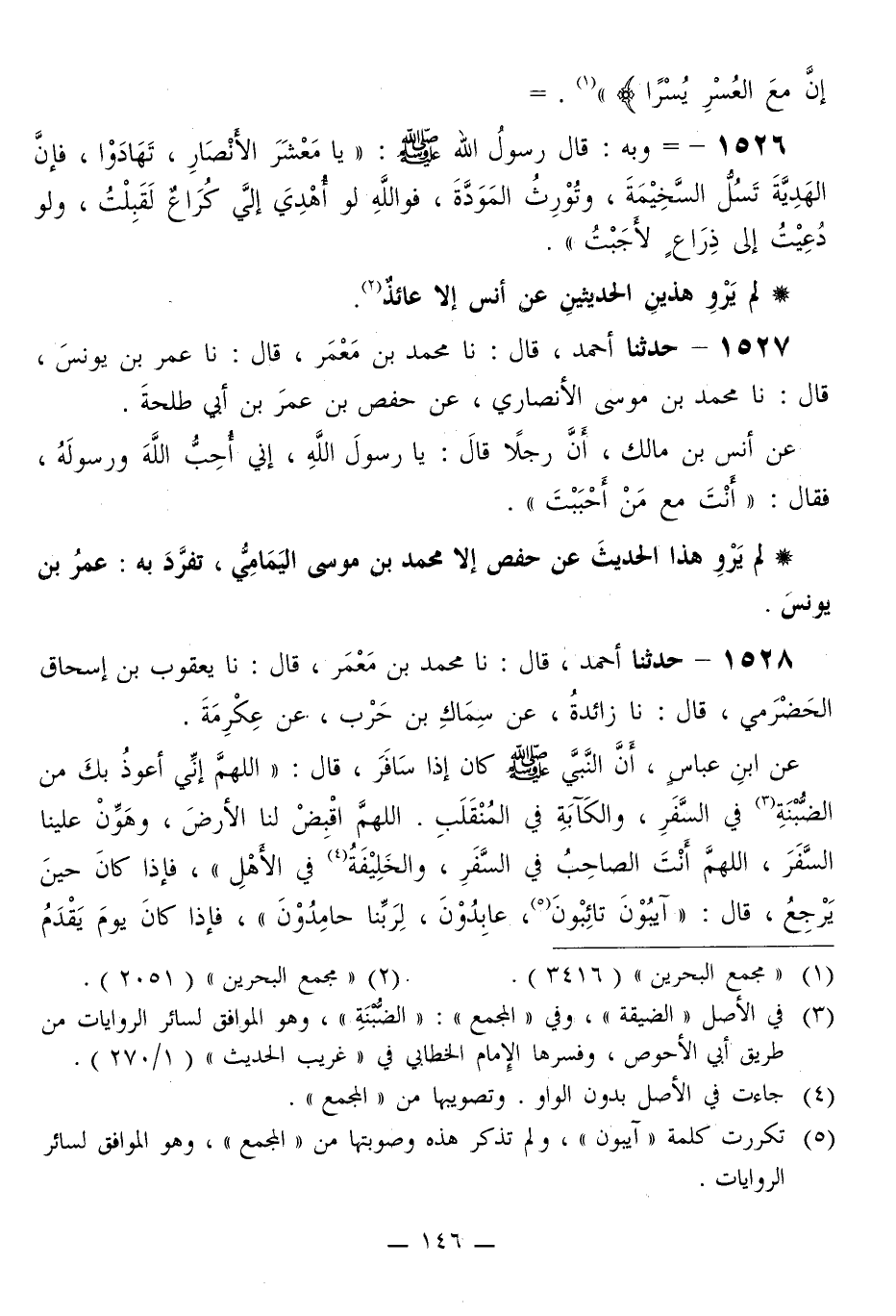 1528 - حَدَّثَنَا أَحْمَدُ قَالَ: نا مُحَمَّدُ بْنُ مَعْمَرٍ قَالَ: نا يَعْقُوبُ بْنُ إِسْحَاقَ الْحَضْرَمِيُّ قَالَ: نا زَائِدَةُ، عَنْ سِمَاكِ بْنِ حَرْبٍ، عَنْ عِكْرِمَةَ، عَنِ ابْنِ عَبَّاسٍ، أَنَّ النَّبِيَّ صَلَّى اللهُ عَلَيْهِ وَسَلَّمَ صَلَّى اللهُ عَلَيْهِ وَسَلَّمَ كَانَ إِذَا سَافَرَ قَالَ: «§اللَّهُمَّ إِنِّي أَعُوذُ بِكَ مِنَ الضُّبْنَةِ فِي السَّفَرِ، وَالْكَآبَةِ فِي الْمُنْقَلَبِ. اللَّهُمَّ اقْبِضْ لَنَا الْأَرْضَ، وَهَوِّنْ عَلَيْنَا السَّفَرَ، اللَّهُمَّ أَنْتَ الصَّاحِبُ فِي السَّفَرِ، وَالْخَلِيفَةُ فِي الْأَهْلِ» ، فَإِذَا كَانَ حِينَ يَرْجِعُ قَالَ: «آيِبُونَ تَائِبُونَ، عَابِدُونَ، لِرَبِّنَا حَامِدُونَ» ، فَإِذَا كَانَ يَوْمُ يَقْدَمُ -[147]- أَهْلَهُ قَالَ: «أَوْبًا أَوْبًا إِلَى رَبِّنَا أَوْبًا، لَا يُغَادِرُ عَلَيْنَا حَوْبًا»