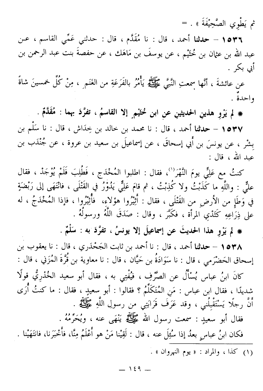 1537 - حَدَّثَنَا أَحْمَدُ قَالَ: نا مُحَمَّدُ بْنُ خَالِدِ بْنِ خِدَاشٍ قَالَ: نا سَلْمُ بْنُ بِشْرٍ، عَنْ يُونُسَ بْنِ أَبِي إِسْحَاقَ، عَنْ إِسْمَاعِيلَ بْنِ سَعِيدِ بْنِ عُرْوَةَ، عَنْ جُنْدُبِ بْنِ عَبْدِ اللَّهِ قَالَ: كُنْتُ مَعَ عَلِيٍّ يَوْمَ النَّهْرِ، فَقَالَ: «اطْلُبُوا الْمُخْدَجَ» ، فَطُلِبَ فَلَمْ يُوجَدْ، فَقَالَ عَلِيٌّ: «وَاللَّهِ مَا كَذَبْتُ وَلَا كُذِبْتُ» ، ثُمَّ قَامَ عَلِيٌّ يَدُورُ فِي الْقَتْلَى، فَانْتَهَى إِلَى رَبْضَةٍ فِي وَطَإٍ مِنَ الْأَرْضِ مِنَ الْقَتْلَى، فَقَالَ: «أَثِيرُوا هَؤُلَاءِ» ، فَأُثِيرُوا، فَإِذَا الْمُخْدَجُ، لَهُ عَلَى ذِرَاعِهِ كَثَدْيِ الْمَرْأَةِ، فَكَبَّرَ، وَقَالَ: «§صَدَقَ اللَّهُ وَرَسُولُهُ»