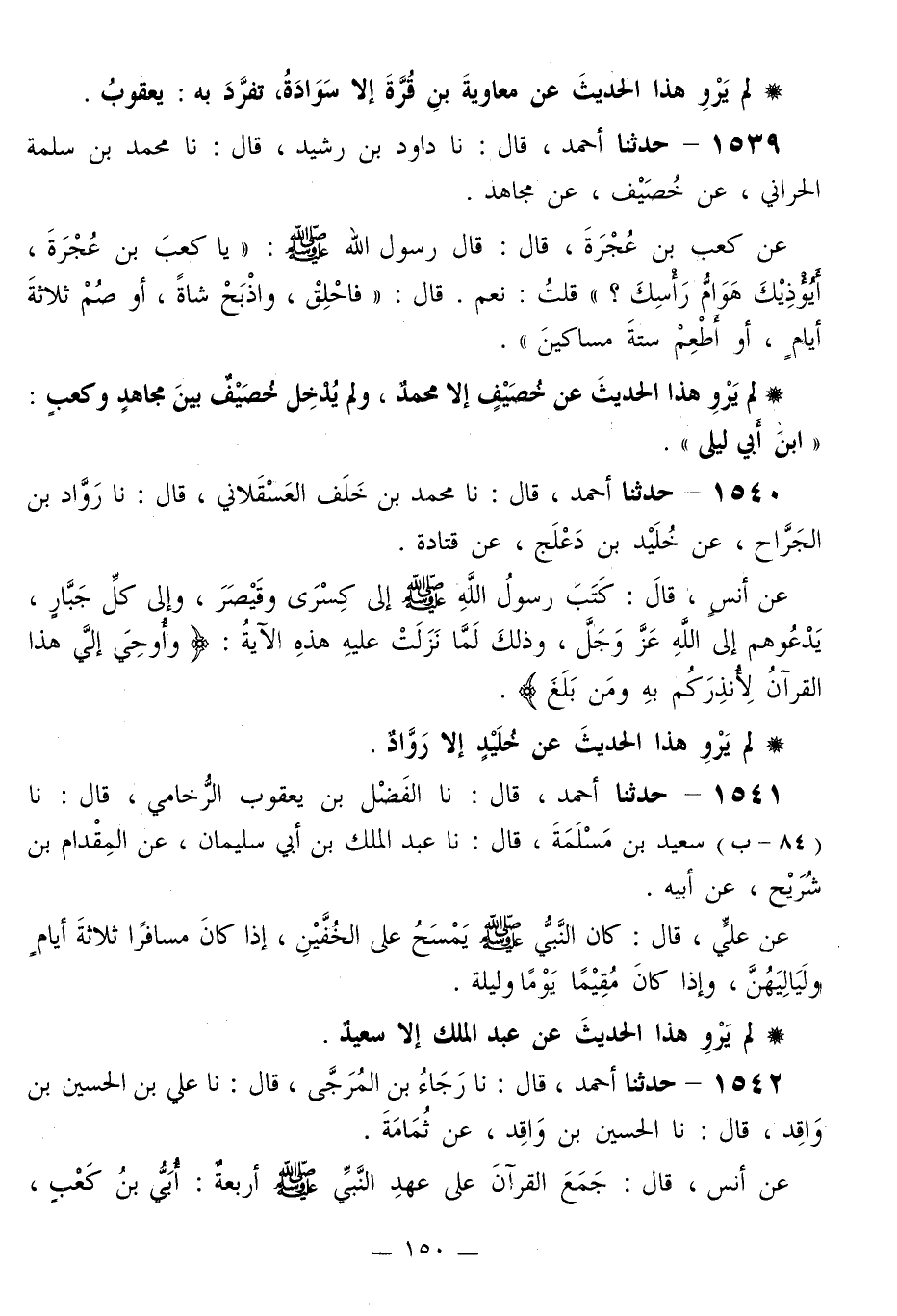 1539 - حَدَّثَنَا أَحْمَدُ قَالَ: نا دَاوُدُ بْنُ رُشَيْدٍ قَالَ: نا مُحَمَّدُ بْنُ سَلَمَةَ الْحَرَّانِيُّ، عَنْ خُصَيْفٍ، عَنْ مُجَاهِدٍ،. عَنْ كَعْبِ بْنِ عُجْرَةَ قَالَ: قَالَ رَسُولُ اللَّهِ صَلَّى اللهُ عَلَيْهِ وَسَلَّمَ: «يَا كَعْبَ بْنَ عُجْرَةَ، أَيُؤْذِيكَ هَوَامُّ رَأْسِكَ؟» قُلْتُ: نَعَمْ. قَالَ: «§فَاحْلِقْ، وَاذْبَحْ شَاةً، أَوْ صُمْ ثَلَاثَةَ أَيَّامٍ، أَوْ أَطْعِمْ سِتَّةَ مَسَاكِينَ»