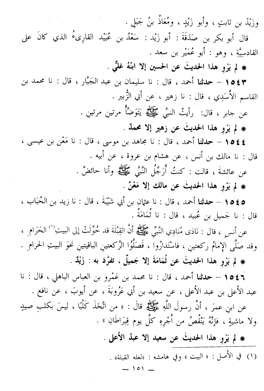 1546 - حَدَّثَنَا أَحْمَدُ قَالَ: نا مُحَمَّدُ بْنُ عَمْرِو بْنِ الْعَبَّاسِ الْبَاهِلِيُّ قَالَ: نا عَبْدُ الْأَعْلَى بْنُ عَبْدِ الْأَعْلَى، عَنْ سَعِيدِ بْنِ أَبِي عَرُوبَةَ، عَنْ أَيُّوبَ، عَنْ نَافِعٍ، عَنِ ابْنِ عُمَرَ، أَنَّ رَسُولَ اللَّهِ صَلَّى اللهُ عَلَيْهِ وَسَلَّمَ قَالَ: «§مَنِ اتَّخَذَ كَلْبًا، لَيْسَ بِكَلْبِ صَيْدٍ وَلَا مَاشِيَةٍ، فَإِنَّهُ يَنْقُصُ مِنْ أَجْرِهِ كُلَّ يَوْمٍ قِيرَاطَانِ»