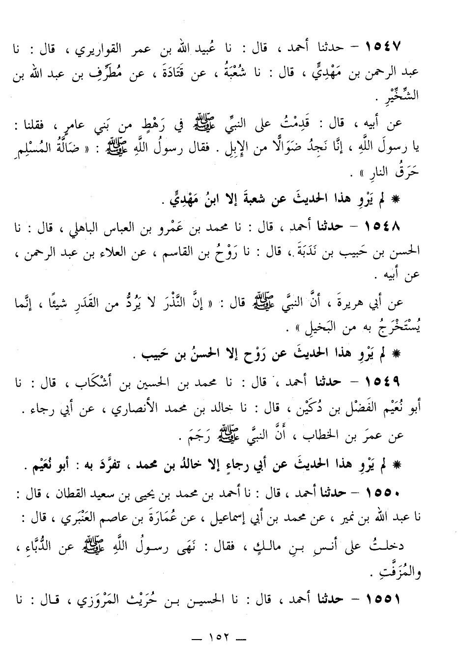 1547 - حَدَّثَنَا أَحْمَدُ قَالَ: نا عُبَيْدُ اللَّهِ بْنُ عُمَرَ الْقَوَارِيرِيُّ قَالَ: نا عَبْدُ الرَّحْمَنِ بْنُ مَهْدِيٍّ قَالَ: نا شُعْبَةُ، عَنْ قَتَادَةَ، عَنْ مُطَرِّفِ بْنِ عَبْدِ اللَّهِ بْنِ الشِّخِّيرِ، عَنْ أَبِيهِ قَالَ: قَدِمْتُ عَلَى النَّبِيِّ صَلَّى اللهُ عَلَيْهِ وَسَلَّمَ فِي رَهْطٍ مِنْ بَنِي عَامِرٍ، فَقُلْنَا: يَا رَسُولَ اللَّهِ، إِنَّا نَجِدُ ضَوَالًّا مِنَ الْإِبِلِ. فَقَالَ رَسُولُ اللَّهِ صَلَّى اللهُ عَلَيْهِ وَسَلَّمَ: «§ضَالَّةُ الْمُسْلِمِ حَرَقُ النَّارِ»