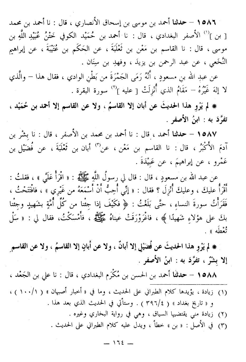 1587 - حَدَّثَنَا أَحْمَدُ قَالَ: نا أَحْمَدُ بْنُ مُحَمَّدِ بْنِ الْأَصْفَرِ قَالَ: نا بِشْرُ بْنُ آدَمَ الْأَكْبَرُ قَالَ: نا الْقَاسِمُ بْنُ مَعْنٍ، عَنْ أَبَانَ بْنِ تَغْلِبِ، عَنْ فُضَيْلِ بْنِ عَمْرٍو، عَنْ إِبْرَاهِيمَ، عَنْ عُبَيْدَةَ، عَنْ عَبْدِ اللَّهِ بْنِ مَسْعُودٍ قَالَ: قَالَ لِي رَسُولُ اللَّهِ صَلَّى اللهُ عَلَيْهِ وَسَلَّمَ: «§اقْرَأْ عَلَيَّ» ، فَقُلْتُ: أَقْرَأُ عَلَيْكَ، وَعَلَيْكَ أُنْزِلَ؟ فَقَالَ: «إِنِّي أُحِبُّ أَنْ أَسْمَعَهُ مِنْ غَيْرِي» ، فَافْتَتَحْتُ، فَقَرَأْتُ سُورَةَ النِّسَاءِ، حَتَّى بَلَغْتُ: {فَكَيْفَ إِذَا جِئْنَا مِنْ كُلِّ أَمَةٍ بِشَهِيدٍ وَجِئْنَا بِكَ عَلَى هَؤُلَاءِ شَهِيدًا} [النساء: 41] فَاغْرَوْرَقَتْ عَيْنَاهُ صَلَّى اللهُ عَلَيْهِ وَسَلَّمَ، فَأَمْسَكْتُ، فَقَالَ لِي: «سَلْ تُعْطَهْ»
