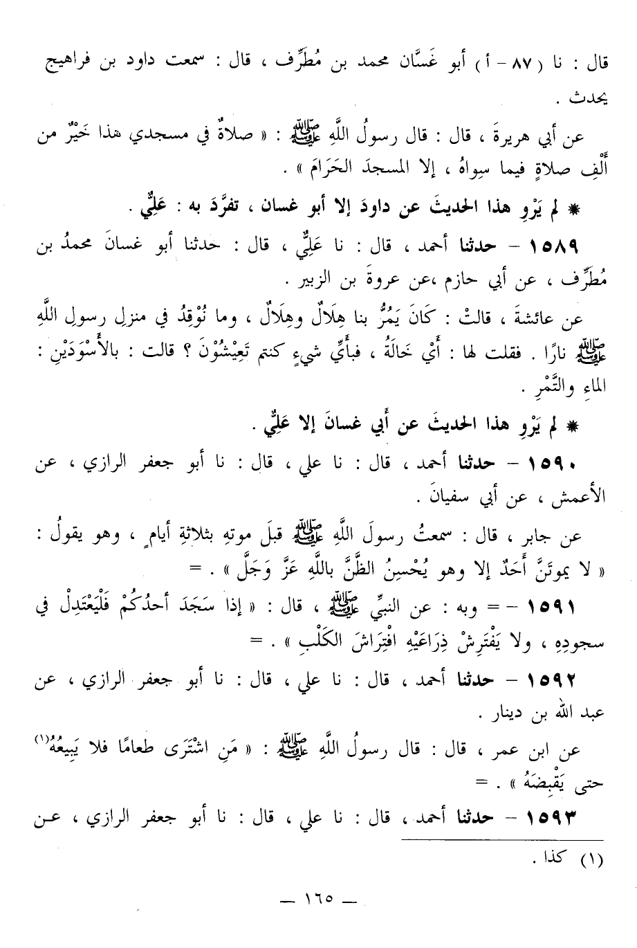 1592 - حَدَّثَنَا أَحْمَدُ قَالَ: نا عَلِيٌّ قَالَ: نا أَبُو جَعْفَرٍ الرَّازِيُّ، عَنْ عَبْدِ اللَّهِ بْنِ دِينَارٍ، عَنِ ابْنِ عُمَرَ قَالَ: قَالَ رَسُولُ اللَّهِ صَلَّى اللهُ عَلَيْهِ وَسَلَّمَ: «§مَنِ اشْتَرَى طَعَامًا فَلَا يَبِعْهُ حَتَّى يَقْبِضَهُ»