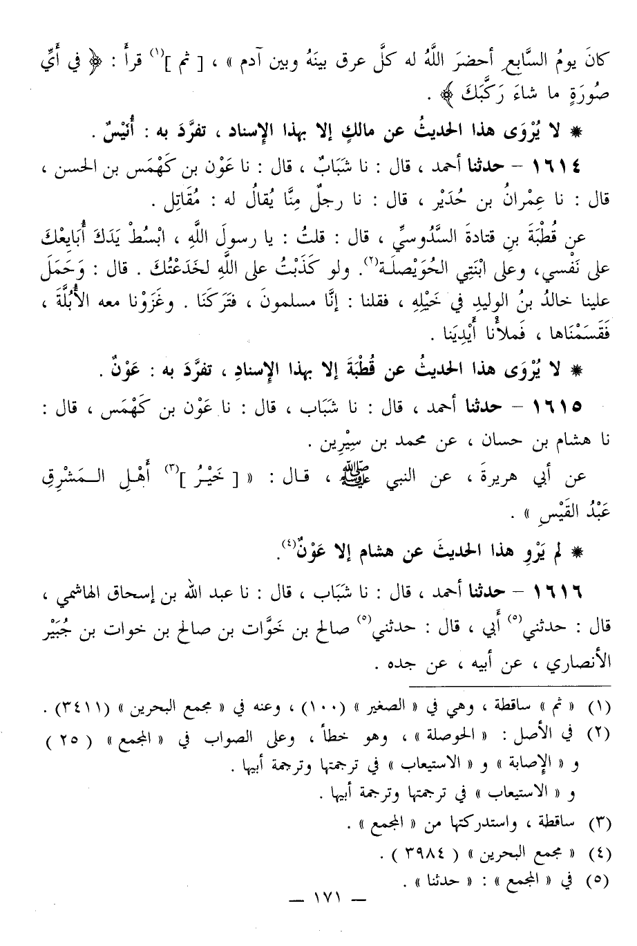 1614 - حَدَّثَنَا أَحْمَدُ قَالَ: نا شَبَابٌ قَالَ: نا عَوْنُ بْنُ كَهْمَسٍ بْنِ الْحَسَنِ قَالَ: نا عِمْرَانُ بْنُ حُدَيْرٍ قَالَ: نا رَجُلٌ، مِنَّا يُقَالُ لَهُ: مُقَاتِلٌ، عَنْ قُطْبَةَ بْنِ قَتَادَةَ السَّدُوسِيِّ قَالَ: قُلْتُ: يَا رَسُولَ اللَّهِ، «§ابْسُطْ يَدَكَ أُبَايِعْكَ عَلَى نَفْسِي، وَعَلَى ابْنَتِي الْحُوَيْصِلَةِ وَلَوْ كَذَبْتُ عَلَى اللَّهِ لَخَدَعْتُكَ» قَالَ: وَحَمَلَ عَلَيْنَا خَالِدُ بْنُ الْوَلِيدِ فِي خَيْلِهِ، فَقُلْنَا: إِنَّا مُسْلِمُونَ، فَتَرَكَنَا. وَغَزَوْنَا مَعَهُ الْأُبُلَّةَ، فَقَسَمْنَاهَا، فَمَلَأْنَا أَيْدِيَنَا «،»