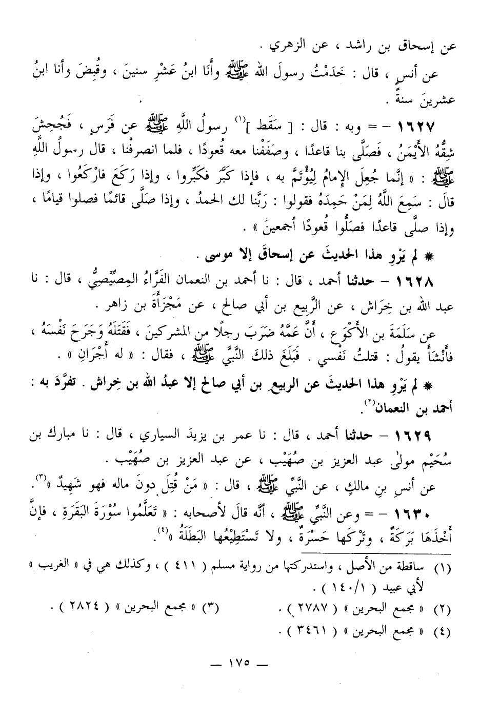 1628 - حَدَّثَنَا أَحْمَدُ قَالَ: نا أَحْمَدُ بْنُ النُّعْمَانِ الْفَرَّاءُ الْمِصِّيصِيُّ قَالَ: نا عَبْدُ اللَّهِ بْنُ خِرَاشٍ، عَنِ الرَّبِيعِ بْنِ أَبِي صَالِحٍ، عَنْ مَجْزَأَةَ بْنِ زَاهِرٍ، عَنْ سَلَمَةَ بْنِ الْأَكْوَعِ، أَنَّ عَمَّهُ ضَرَبَ رَجُلًا مِنَ الْمُشْرِكِينَ، فَقَتَلَهُ وَجَرَحَ نَفْسَهُ، فَأَنْشَأَ يَقُولُ: قَتَلْتُ نَفْسِي. فَبَلَغَ ذَلِكَ النَّبِيَّ صَلَّى اللهُ عَلَيْهِ وَسَلَّمَ، فَقَالَ: «§لَهُ أَجْرَانِ»