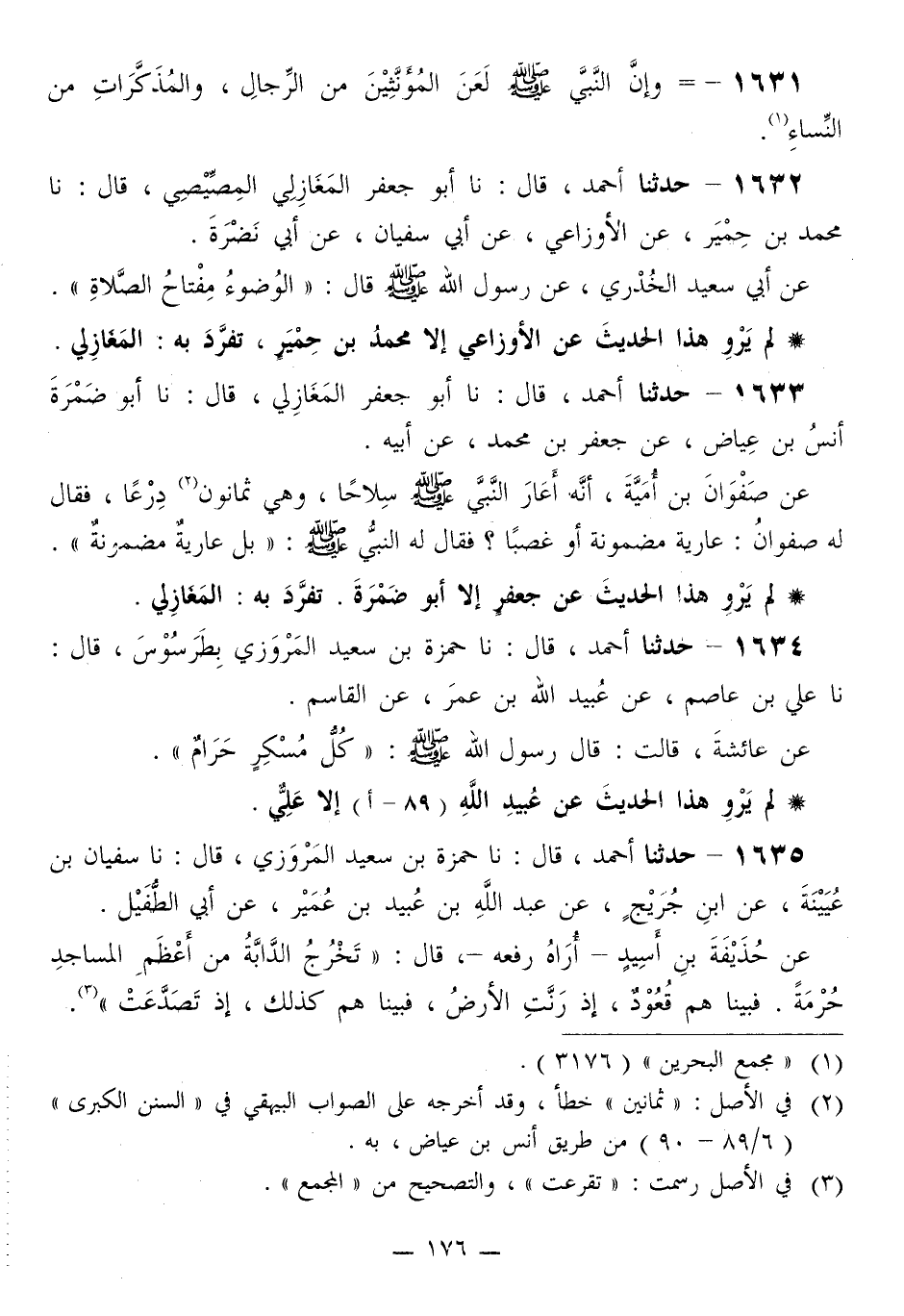 1633 - حَدَّثَنَا أَحْمَدُ قَالَ: نا أَبُو جَعْفَرٍ الْمَغَازِلِيُّ قَالَ: نا أَبُو ضَمْرَةَ أَنَسُ بْنُ عِيَاضٍ، عَنْ جَعْفَرِ بْنِ مُحَمَّدٍ، عَنْ أَبِيهِ، عَنْ صَفْوَانَ بْنِ أُمَيَّةَ، أَنَّهُ أَعَارَ النَّبِيَّ صَلَّى اللهُ عَلَيْهِ وَسَلَّمَ سِلَاحًا، وَهِيَ ثَمَانُونَ دِرْعًا، فَقَالَ لَهُ صَفْوَانُ: عَارِيَةٌ مَضْمُونَةٌ أَوْ غَصْبًا؟ فَقَالَ لَهُ النَّبِيُّ صَلَّى اللهُ عَلَيْهِ وَسَلَّمَ: «§بَلْ عَارِيَةٌ مَضْمُونَةٌ»