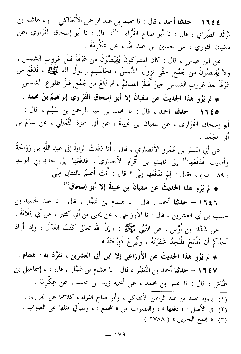 1644 - حَدَّثَنَا أَحْمَدُ قَالَ: نا مُحَمَّدُ بْنُ عَبْدِ الرَّحْمَنِ الْأَنْطَاكِيُّ، ونا هَاشِمُ بْنُ مَرْثَدٍ الطَّبَرَانِيُّ قَالَ: نا أَبُو صَالِحٍ الْفَرَّاءُ قَالَ: نا أَبُو إِسْحَاقَ الْفَزَارِيُّ، عَنْ سُفْيَانَ الثَّوْرِيِّ، عَنْ حُسَيْنِ بْنِ عَبْدِ اللَّهِ، عَنْ عِكْرِمَةَ، عَنِ ابْنِ عَبَّاسٍ قَالَ: كَانَ الْمُشْرِكُونَ يُفِيضُونَ مِنْ عَرَفَةَ قَبْلَ غُرُوبِ الشَّمْسِ، وَلَا يُفِيضُونَ مِنْ جَمْعٍ حَتَّى تَزُولَ الشَّمْسُ، فَخَالَفَهُمْ رَسُولُ اللَّهِ صَلَّى اللهُ عَلَيْهِ وَسَلَّمَ، «§فَدَفَعَ مِنْ عَرَفَةَ بَعْدَ غُرُوبِ الشَّمْسِ حِينَ أَفْطَرَ الصَّائِمُ، ثُمَّ دَفَعَ مِنْ جَمْعٍ قَبْلَ طُلُوعِ الشَّمْسِ»